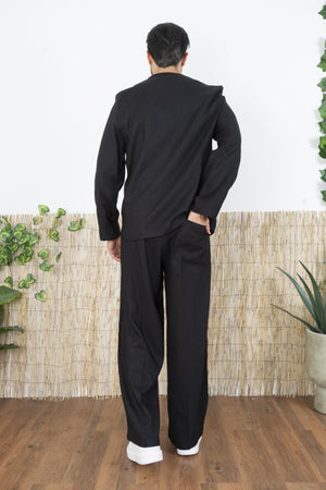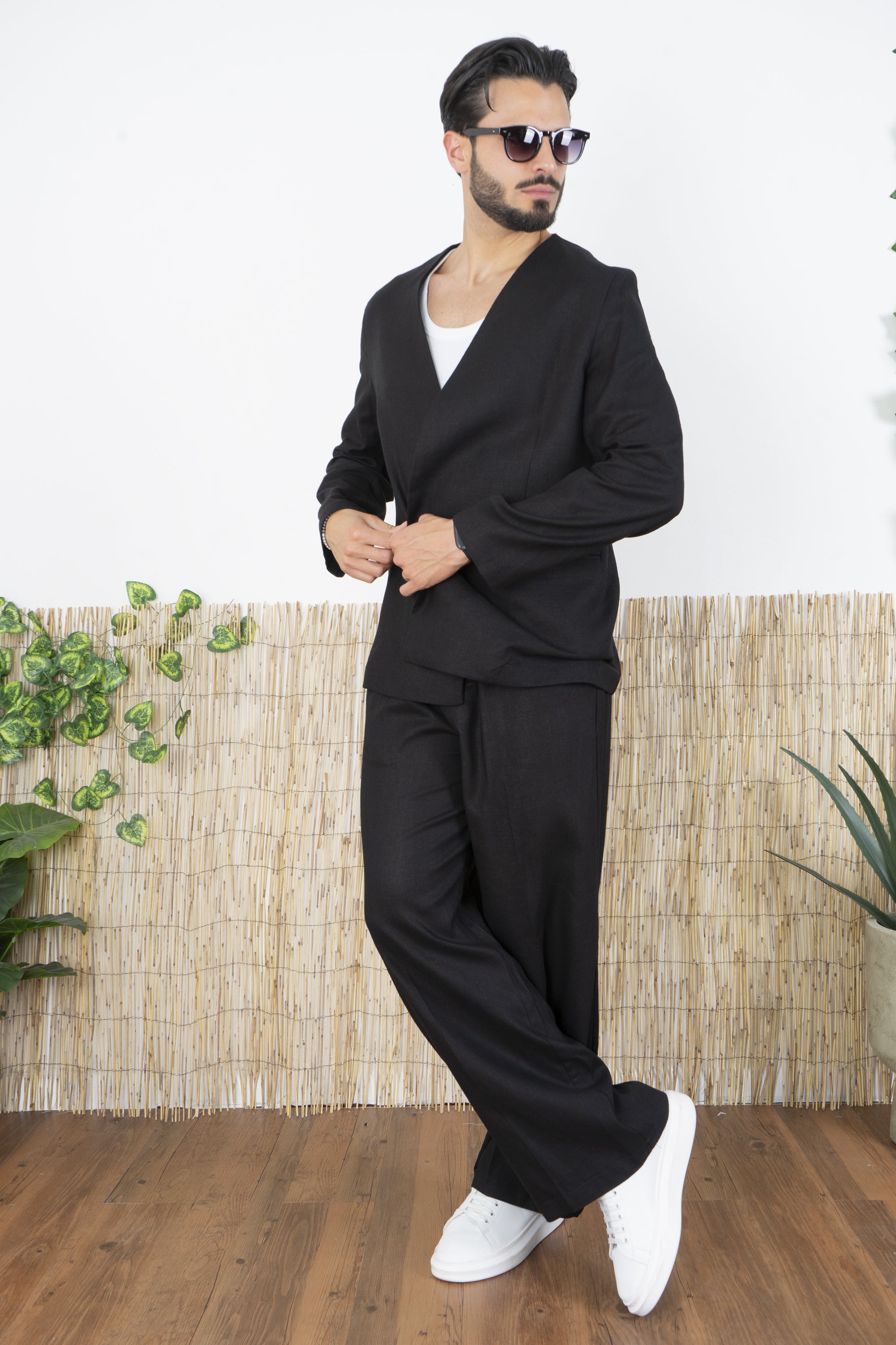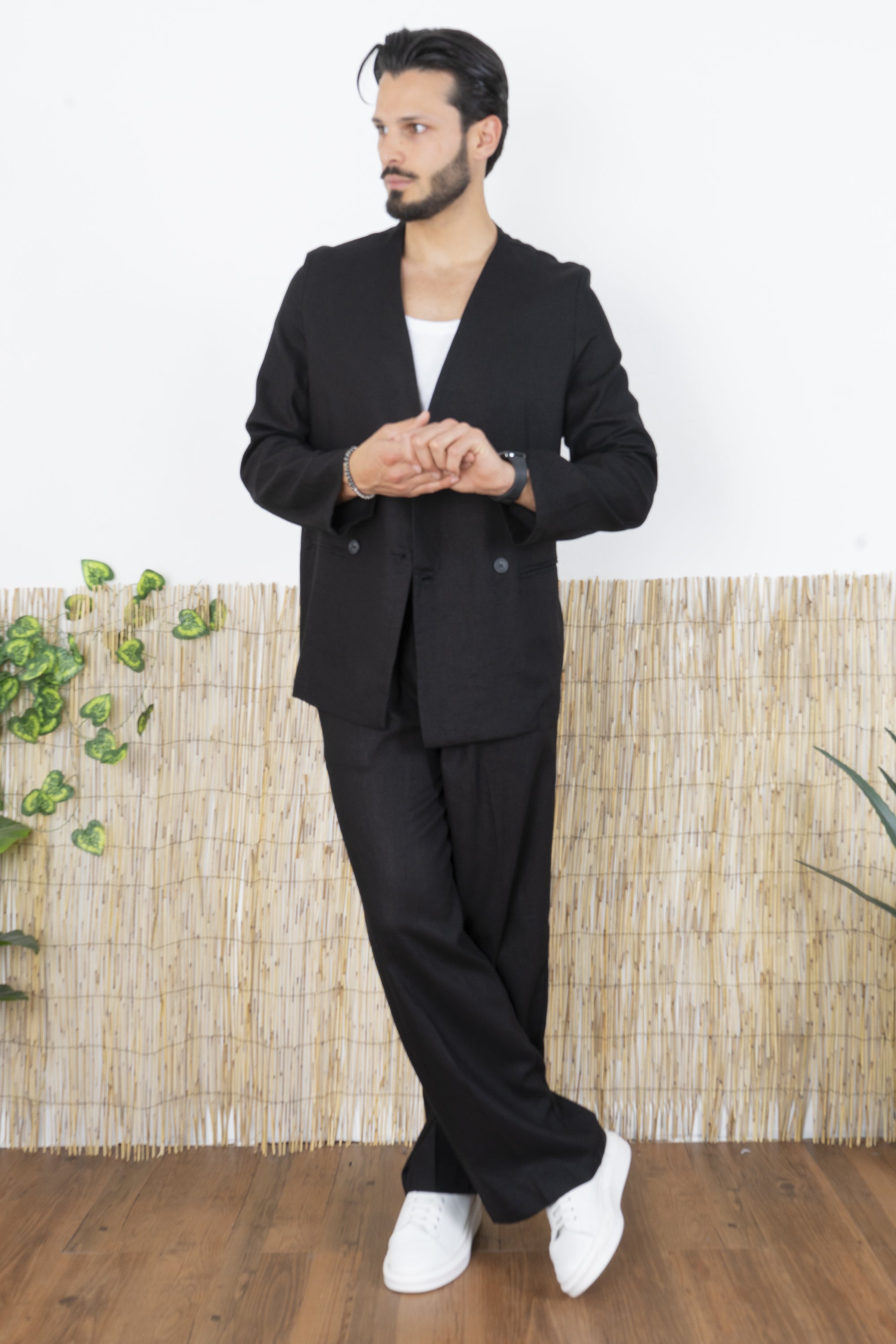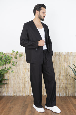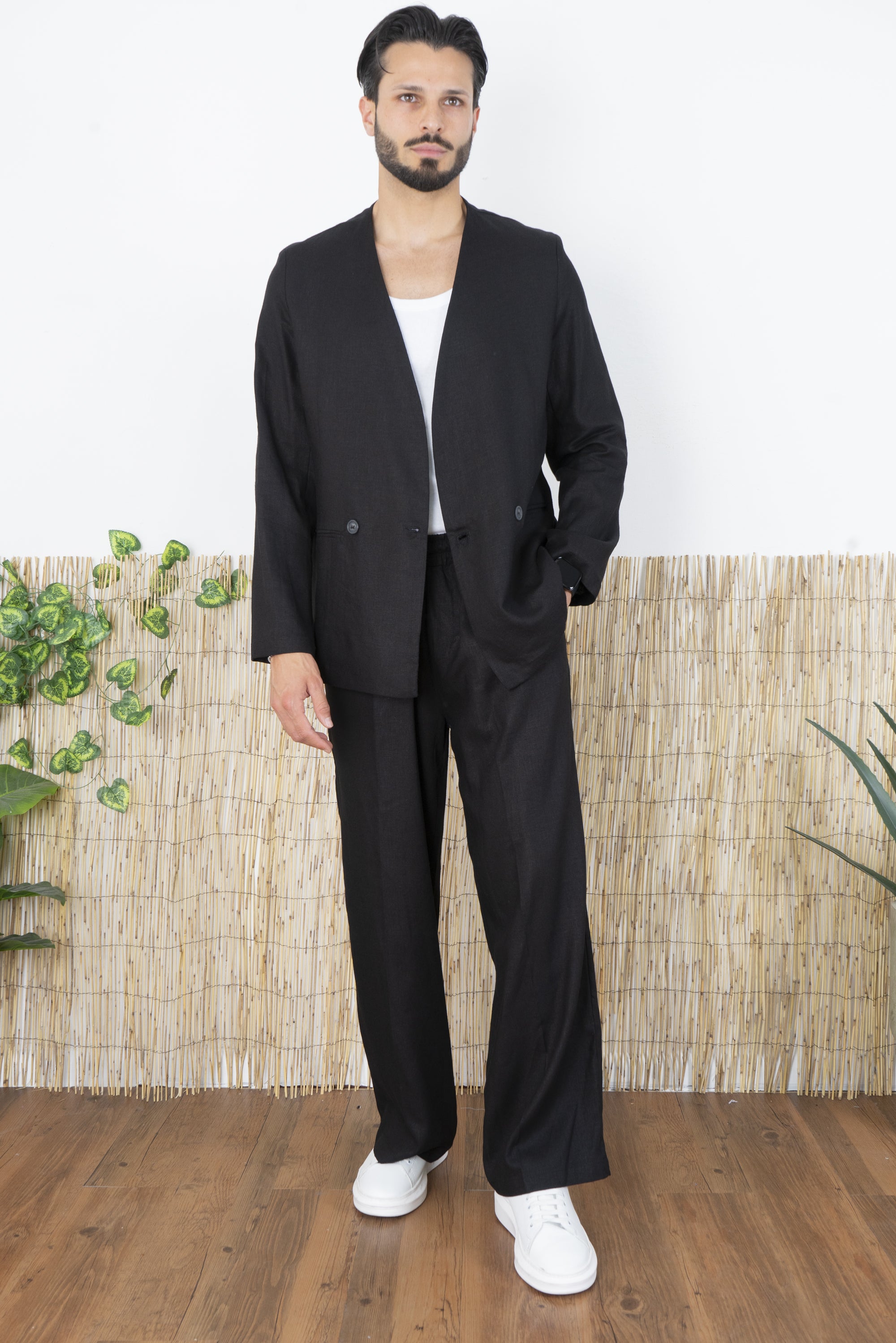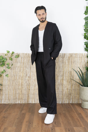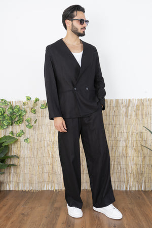 -Rinnova il tuo guardaroba con questo completo in Lino dal taglio moderno e minimalista. Composto da una giacca doppiopetto senza revers e da pantaloni ampi, questo set è perfetto per chi desidera uno stile raffinato ma al tempo stesso innovativo. La giacca presenta un design pulito e contemporaneo, con chiusura a due bottoni frontali e una struttura senza bavero, che valorizza la linea del collo e offre un’alternativa moderna alle classiche giacche formali. I pantaloni hanno una gamba ampia e fluida, che assicura comfort e un’estetica relaxed, perfetta per outfit eleganti ma versatili.