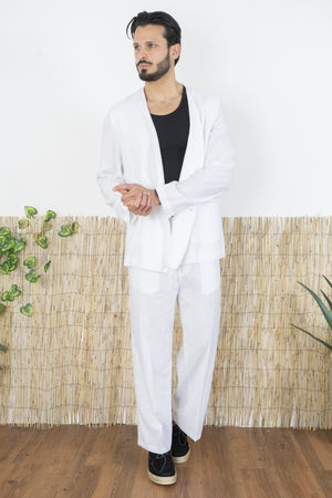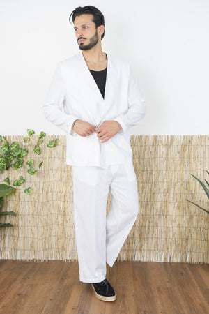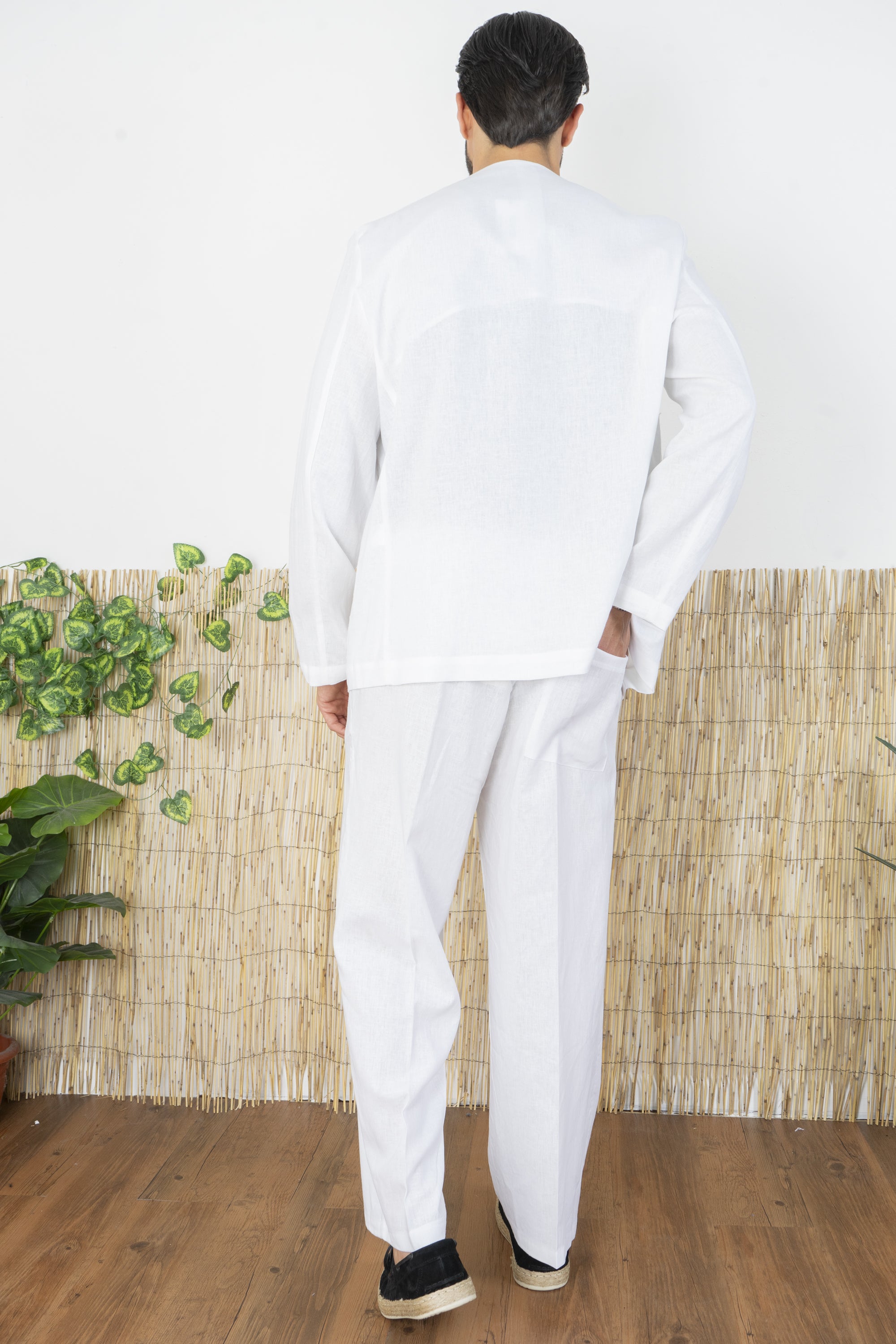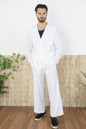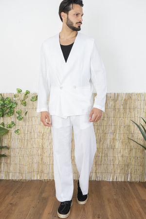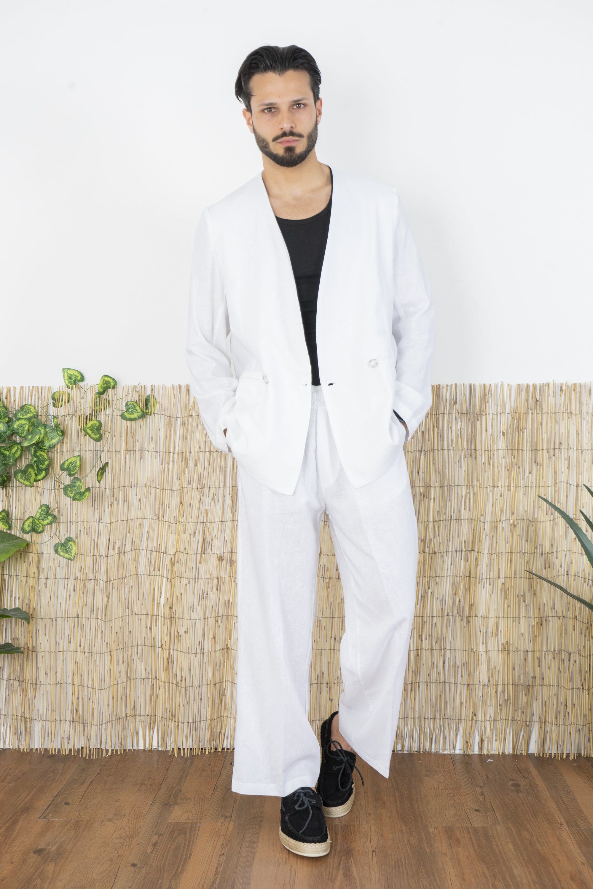 -Rinnova il tuo guardaroba con questo completo in Lino dal taglio moderno e minimalista. Composto da una giacca doppiopetto senza revers e da pantaloni ampi, questo set è perfetto per chi desidera uno stile raffinato ma al tempo stesso innovativo. La giacca presenta un design pulito e contemporaneo, con chiusura a due bottoni frontali e una struttura senza bavero, che valorizza la linea del collo e offre un’alternativa moderna alle classiche giacche formali. I pantaloni hanno una gamba ampia e fluida, che assicura comfort e un’estetica relaxed, perfetta per outfit eleganti ma versatili.