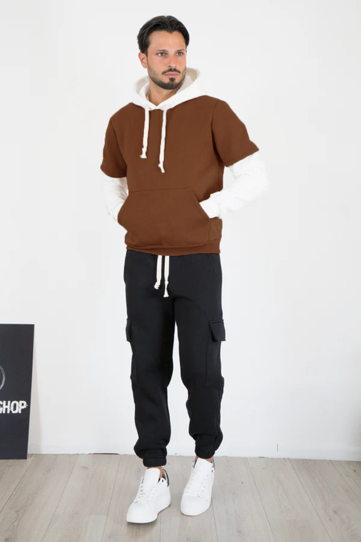 La felpa presenta maniche lunghe bianche a contrasto e strato esterno color cammello a manica corta, con tasca a marsupio e coulisse regolabile.