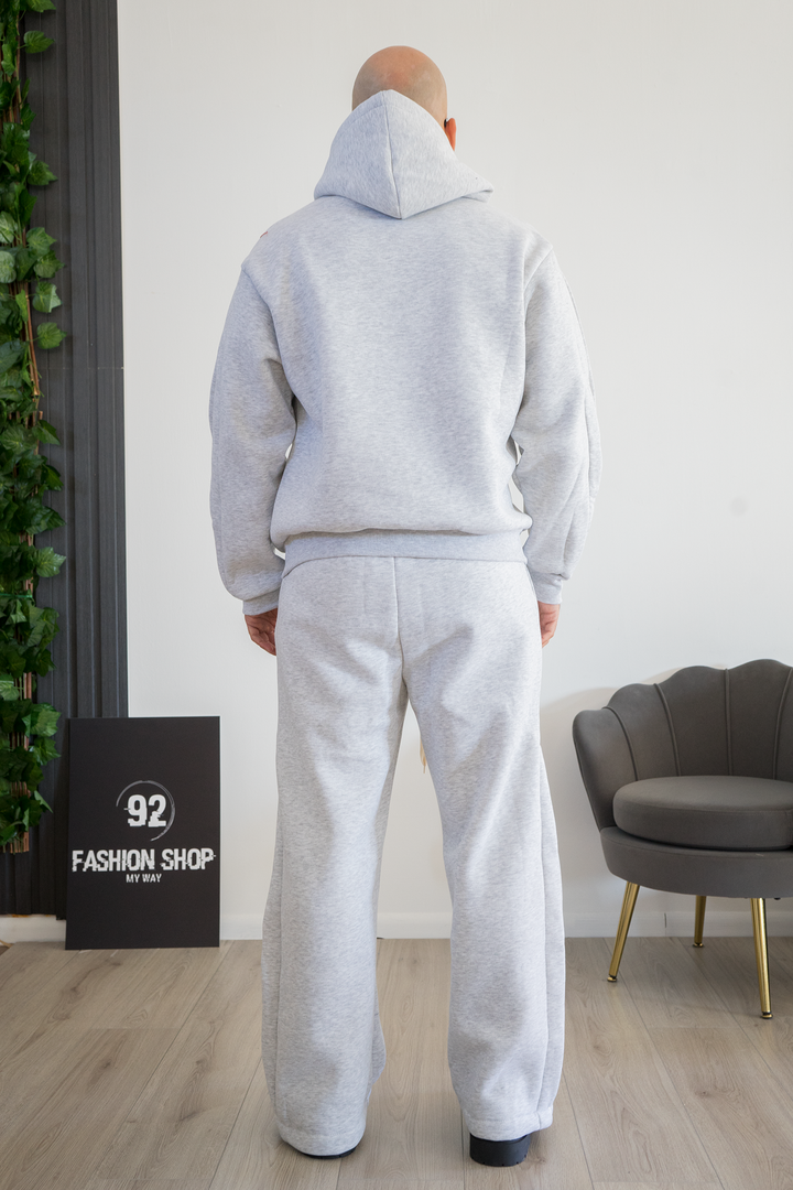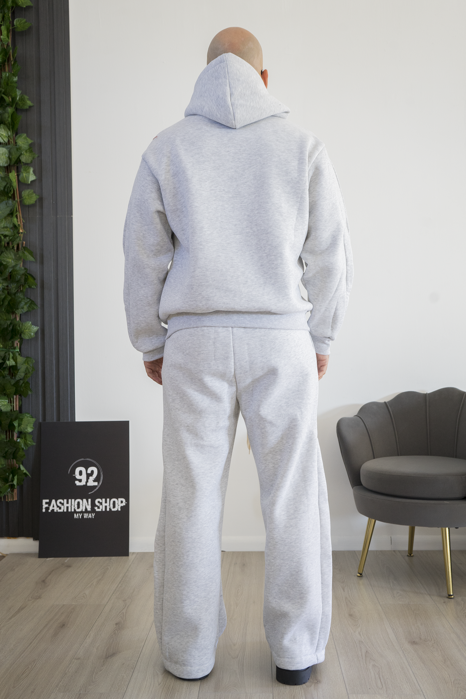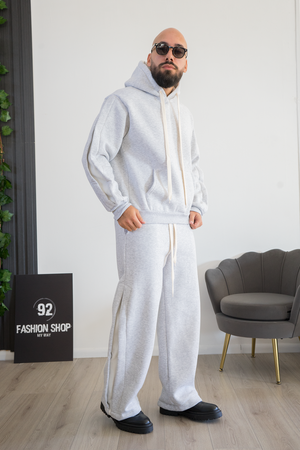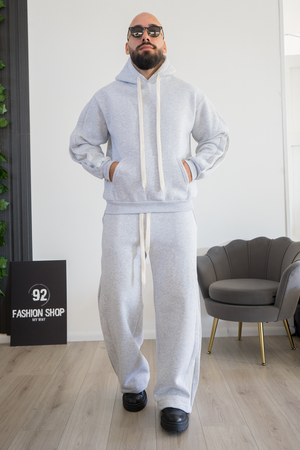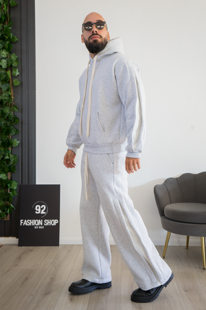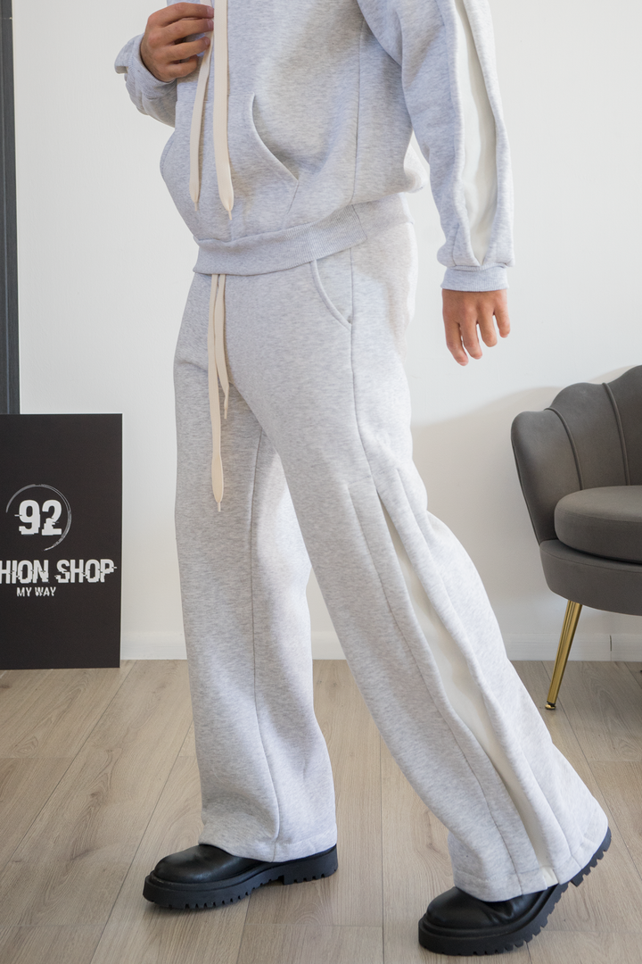 La felpa con cappuccio presenta maxi coulisse bianche e tasca a marsupio, mentre i pantaloni a gamba larga sono arricchiti da bande laterali bianche che donano un tocco sportivo e moderno.