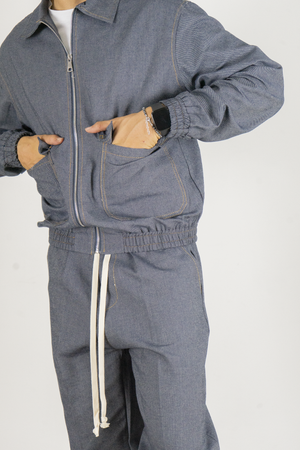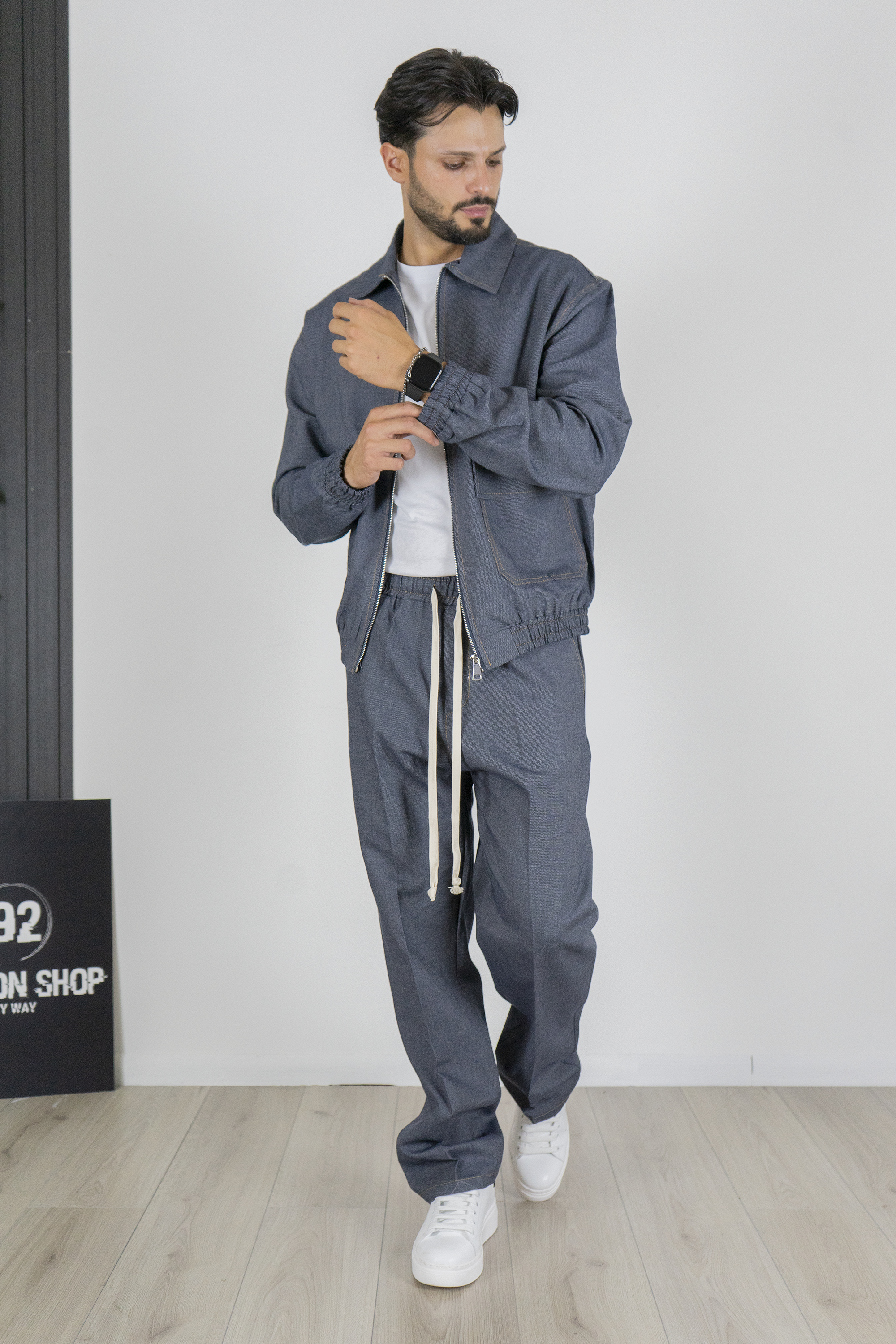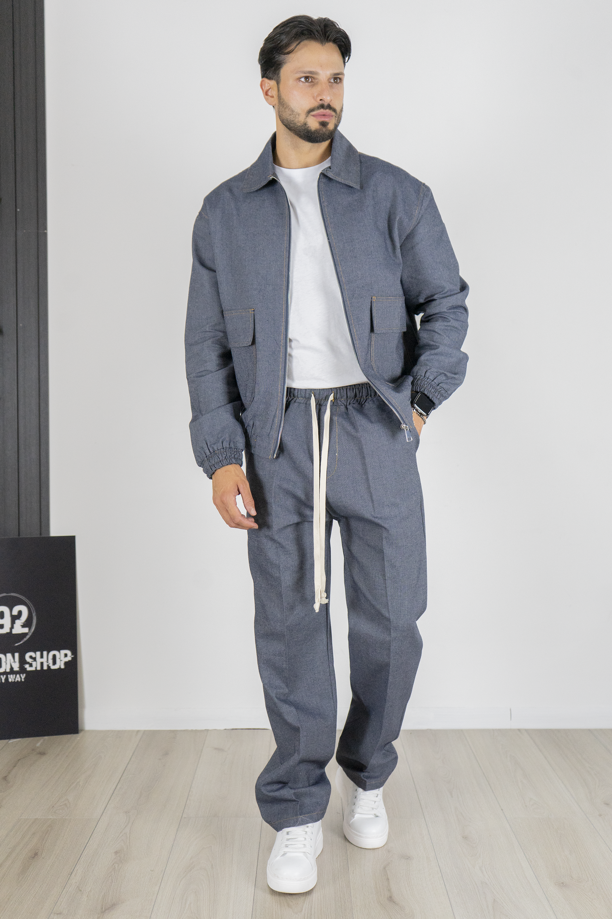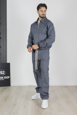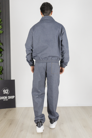 -Aggiungi un tocco di comfort e stile urban al tuo guardaroba con questo completo uomo in jeans, composto da una giacca con elastico in vita e pantaloni jogger. La giacca presenta una vestibilità comoda con un taglio moderno e l'elastico in vita che offre un effetto bomber, mentre le tasche laterali aggiungono un tocco pratico e funzionale. La zip frontale completa il design, rendendola perfetta per un look casual e dinamico.