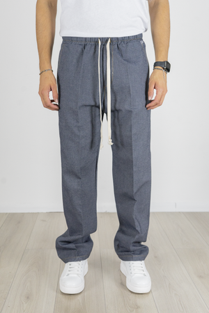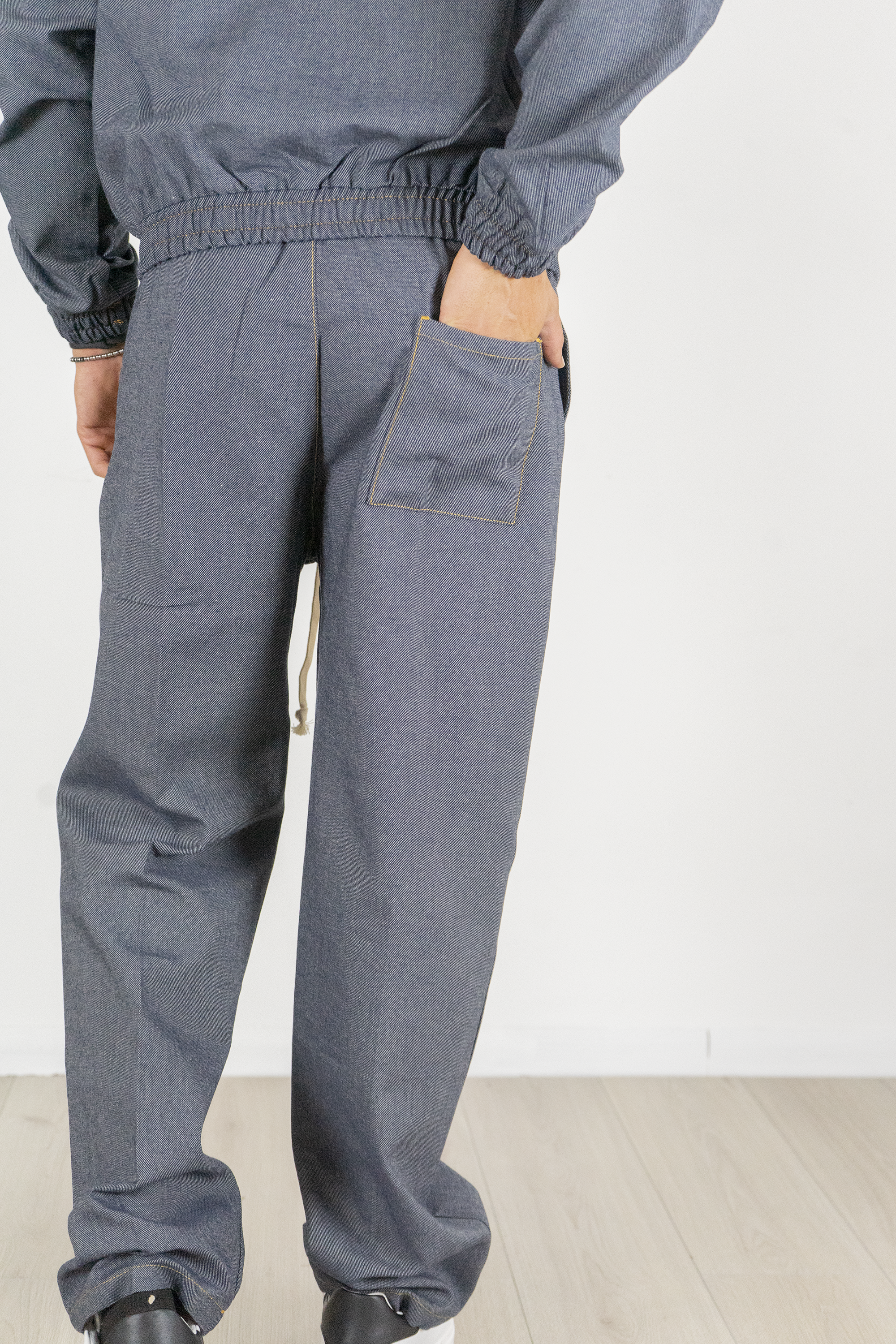 I pantaloni jogger con vita elastica e cordino regolabile garantiscono una vestibilità comoda e personalizzabile, mentre la gamba affusolata e l'elastico alla caviglia completano il look sportivo e moderno. Realizzato in denim di alta qualità, questo completo è ideale per ogni occasione, dalla quotidianità agli outfit più casual-chic.