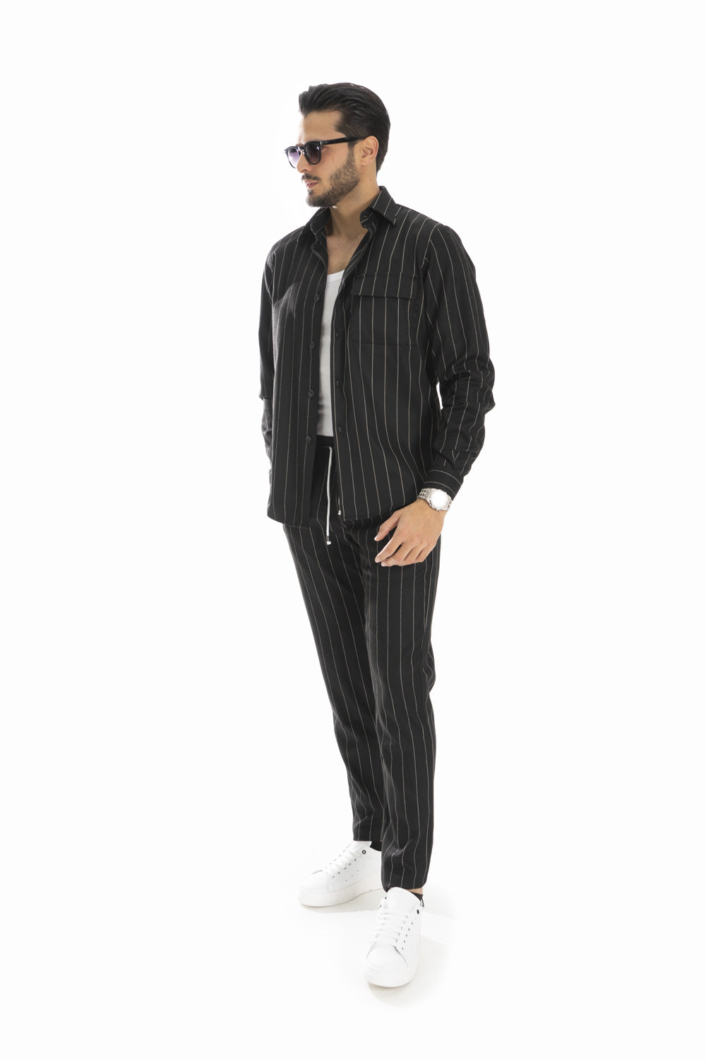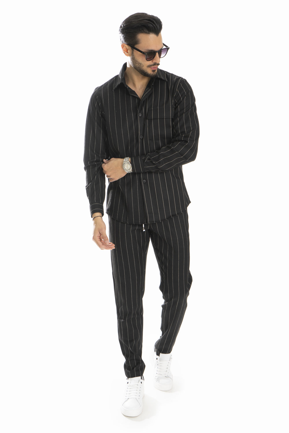 "Esplora l'eleganza senza sforzo con il nostro coordinato camicia e pantalone gessato! Creato con maestria in Italia utilizzando tessuti di alta qualità, questo ensemble incarna lo stile casual con un tocco di raffinatezza. Aggiungi un tocco di classe alla tua collezione di abbigliamento con questa creazione senza tempo."