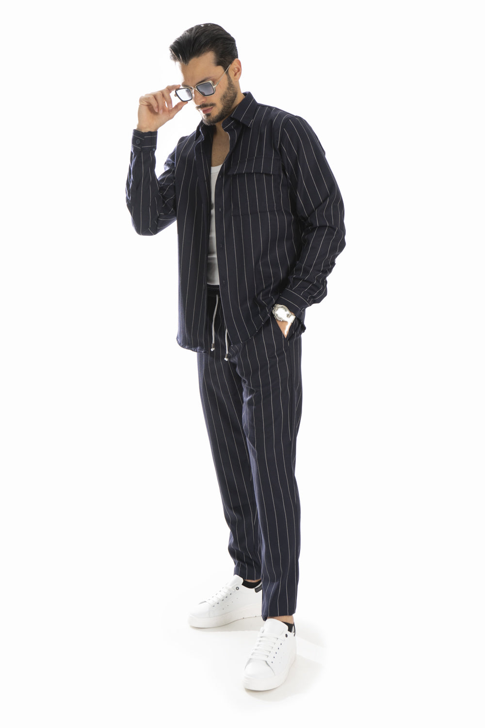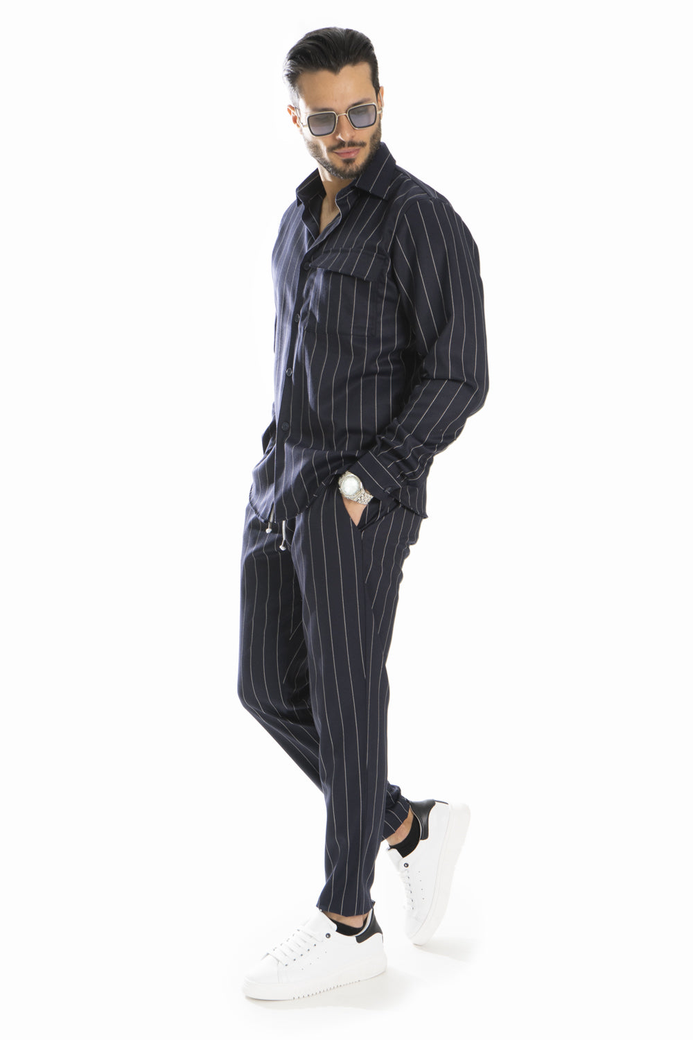 "Esplora l'eleganza senza sforzo con il nostro coordinato camicia e pantalone gessato! Creato con maestria in Italia utilizzando tessuti di alta qualità, questo ensemble incarna lo stile casual con un tocco di raffinatezza. Aggiungi un tocco di classe alla tua collezione di abbigliamento con questa creazione senza tempo."