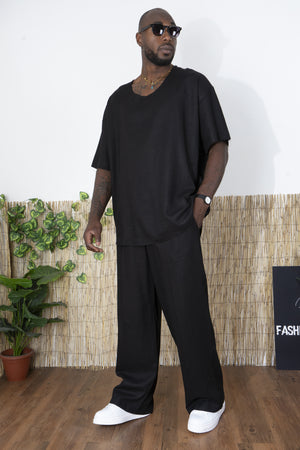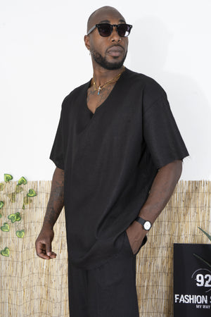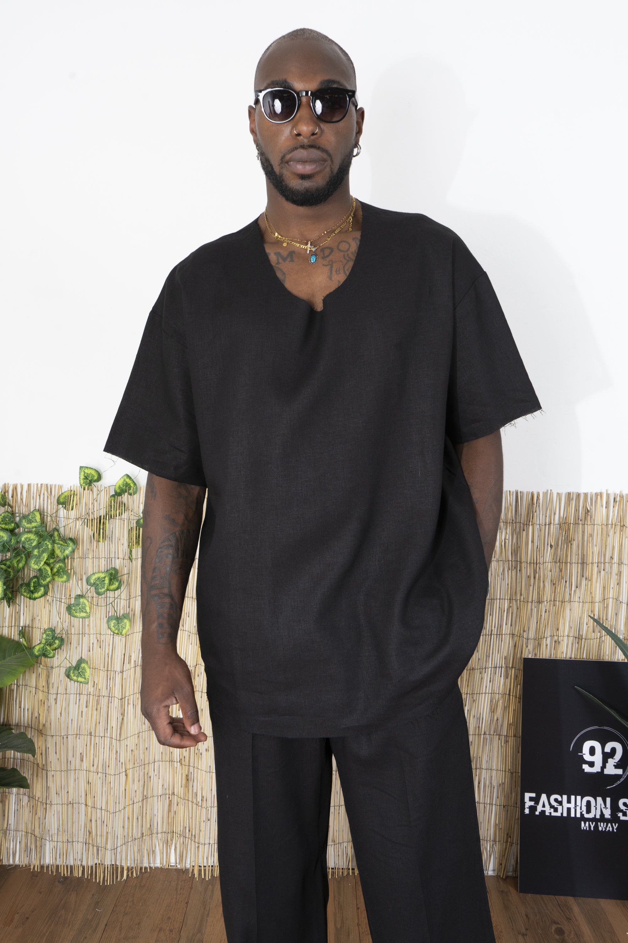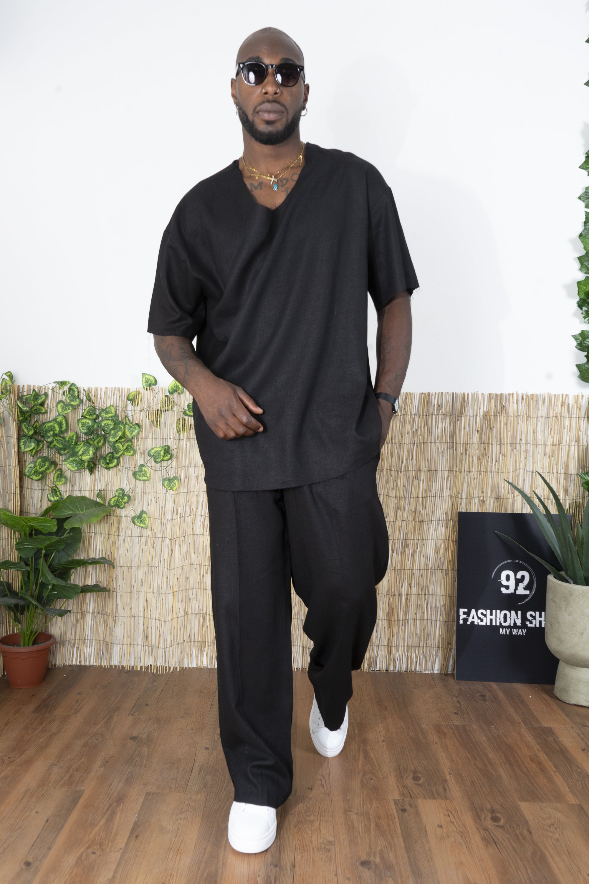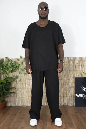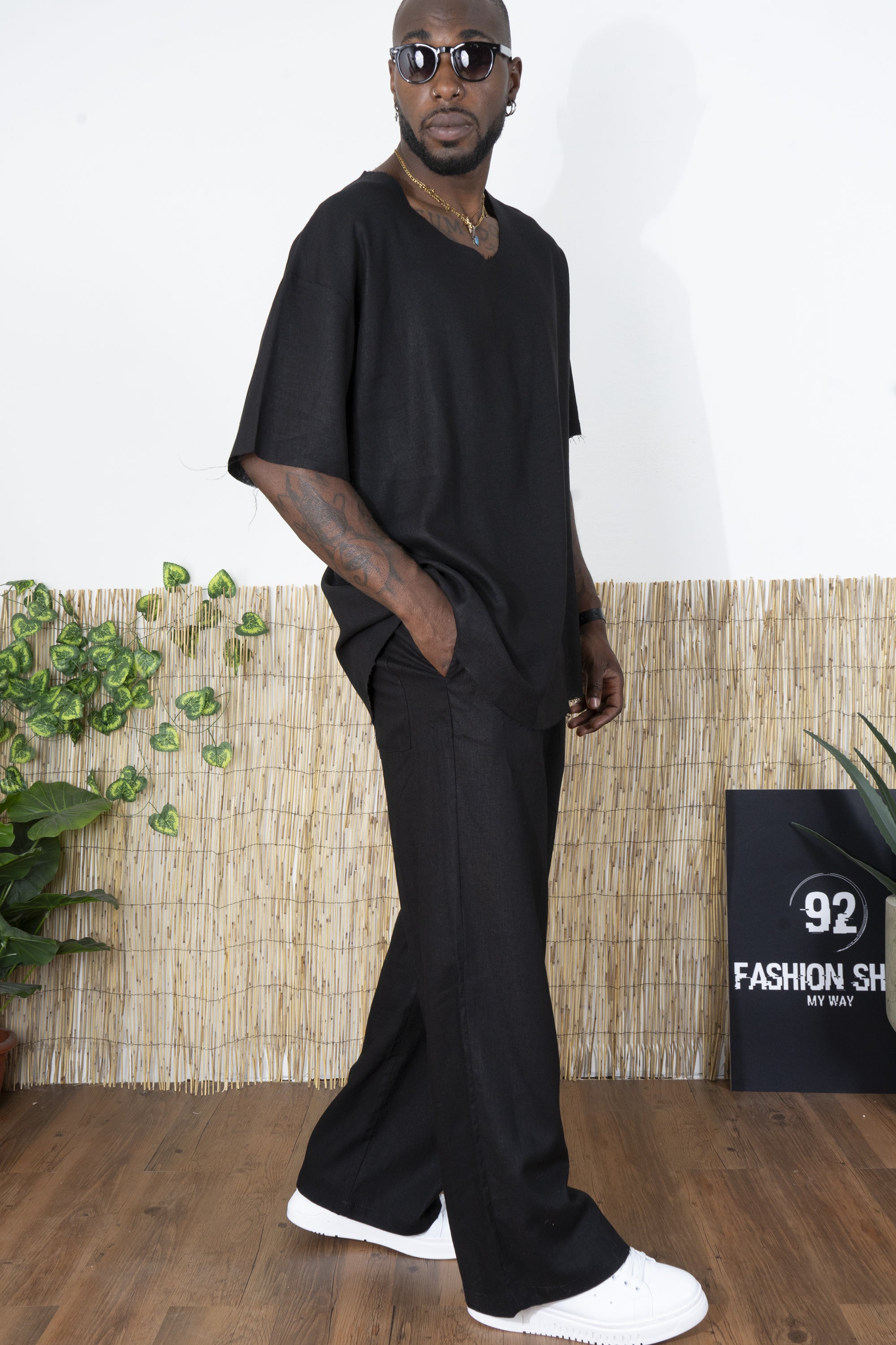 -Scopri l'eleganza rilassata con il coordinato uomo oversize di 92 Fashion Shop, composto da una T-shirt con scollo a V e taglio vivo e pantaloni larghi. Ideale per un look sofisticato e confortevole durante l'estate