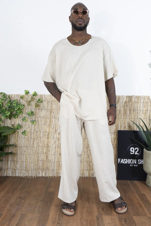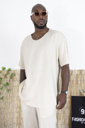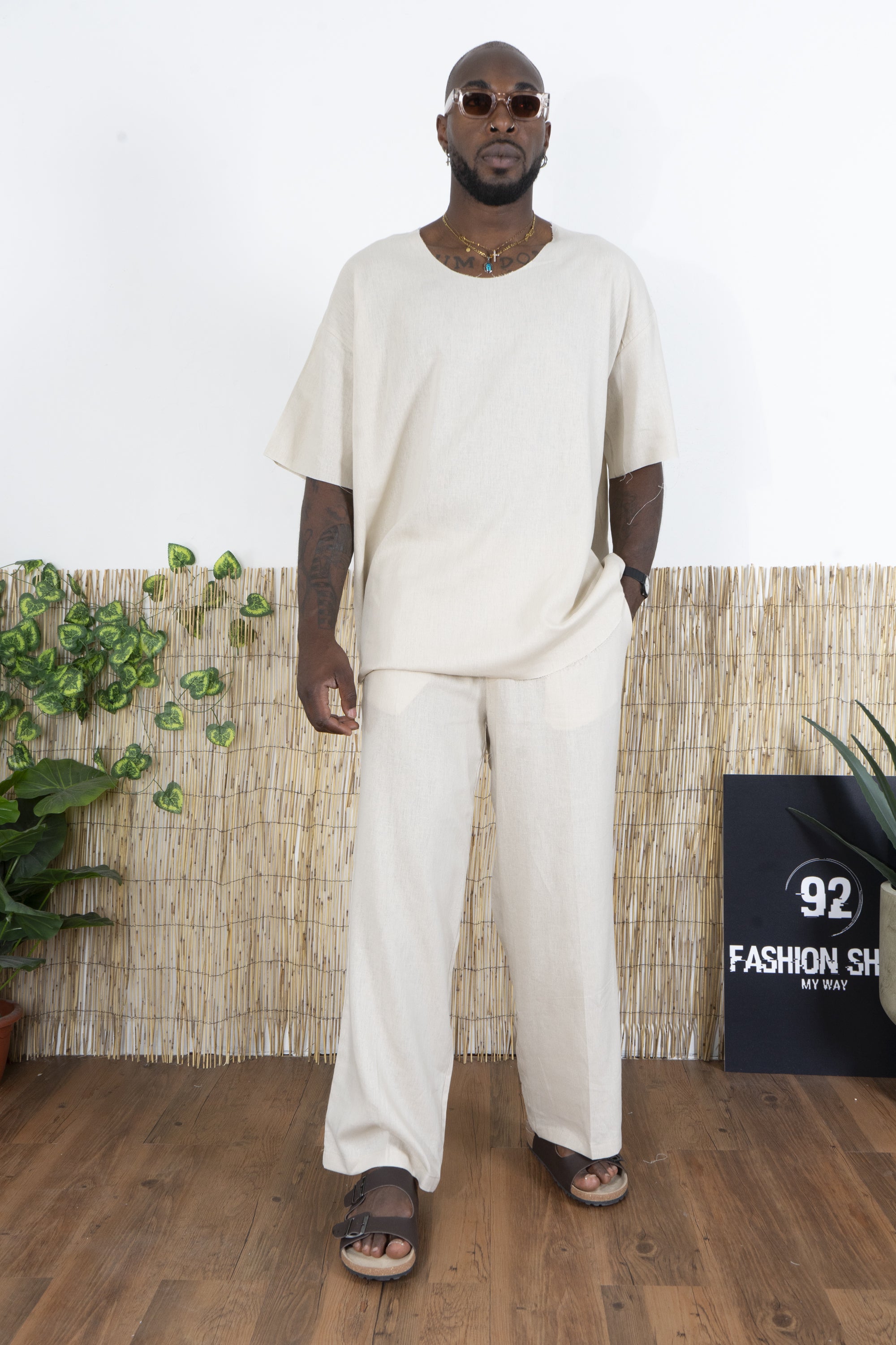 -Scopri l'eleganza rilassata con il coordinato uomo oversize di 92 Fashion Shop, composto da una T-shirt con scollo a V e taglio vivo e pantaloni larghi. Ideale per un look sofisticato e confortevole durante l'estate