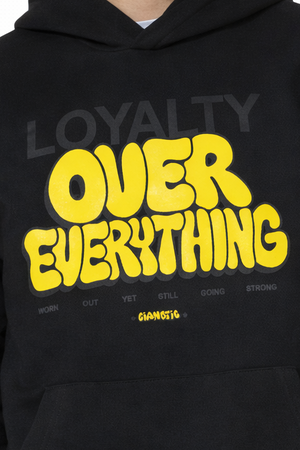 -Felpa uomo con cappuccio in colore Nero, caratterizzata da stampa frontale “Loyalty Over Everything” in giallo e nero dallo stile streetwear deciso. Dotata di tasca a marsupio e polsini elasticizzati, offre comfort e praticità senza rinunciare al design moderno. Perfetta per outfit casual e urban, da abbinare a jeans strappati o cargo con sneakers.
