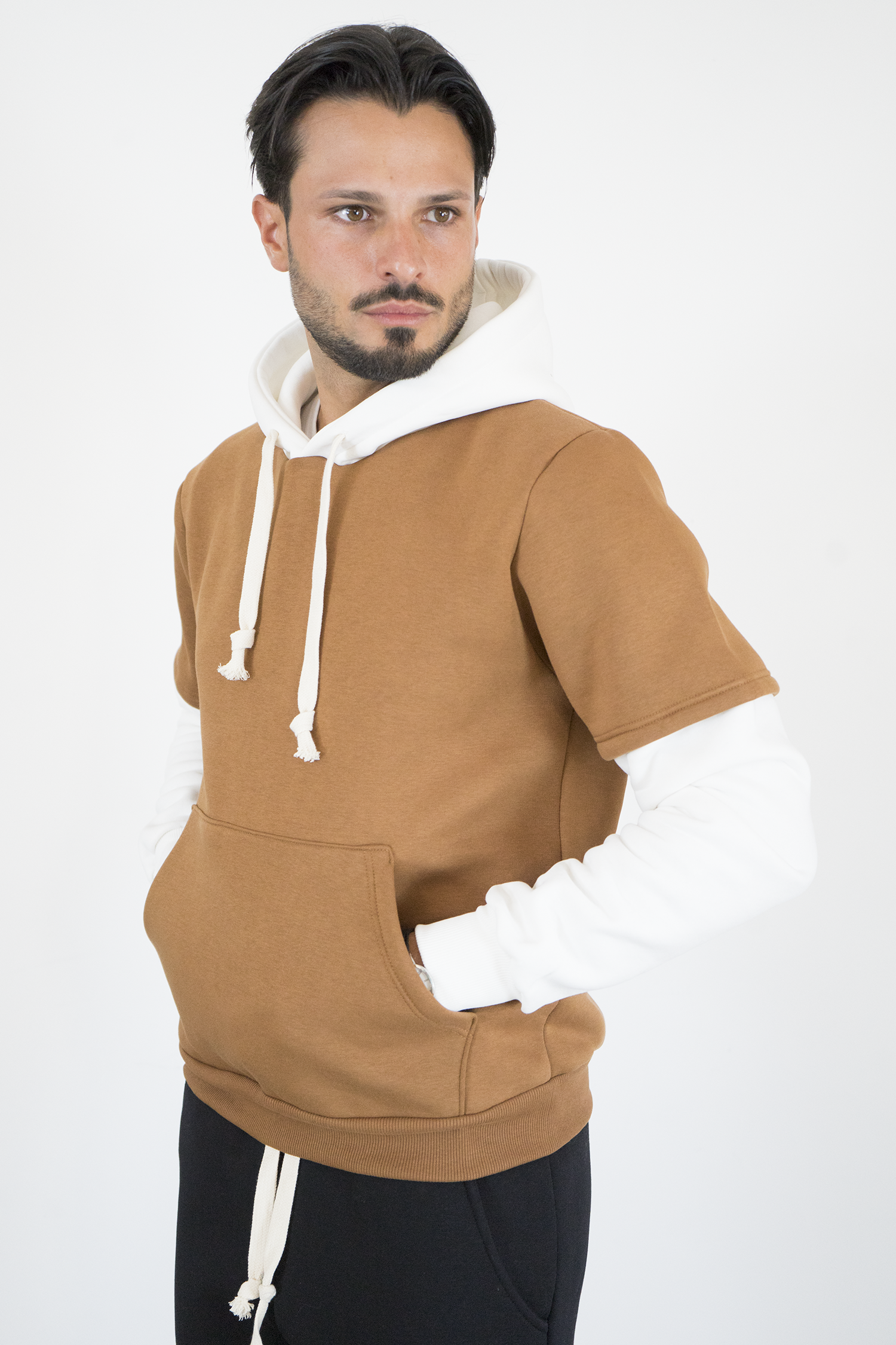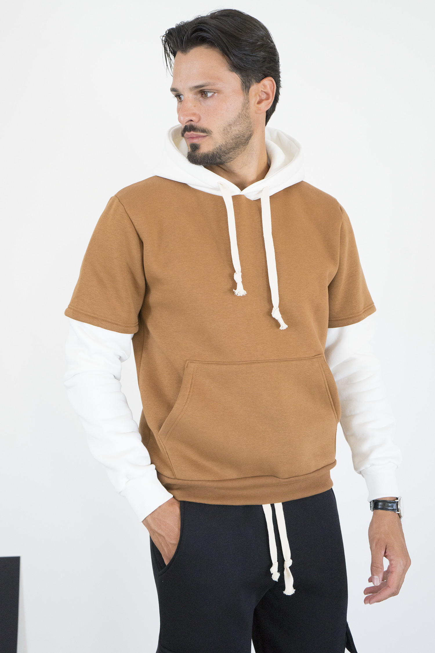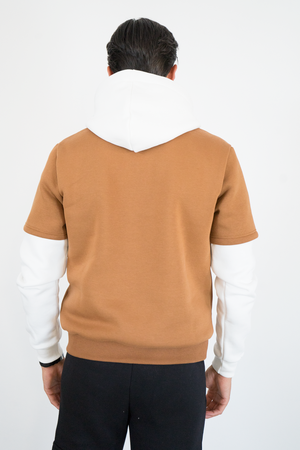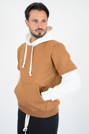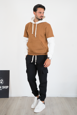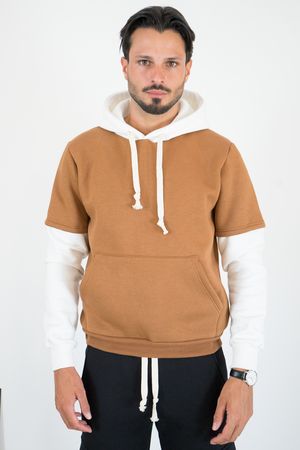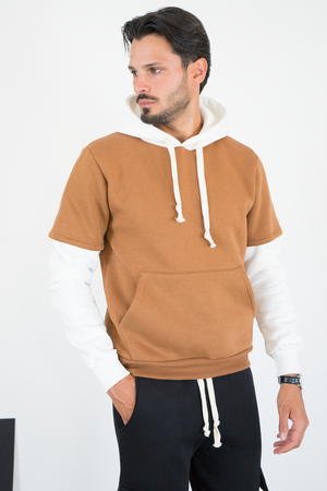 -Felpa uomo con cappuccio caratterizzata da design con doppia manica a contrasto. Realizzata in tessuto morbido e confortevole, presenta cappuccio con coulisse, tasca a marsupio frontale e vestibilità regolare. Uno stile unico che unisce casual e streetwear, ideale per outfit originali e di tendenza.