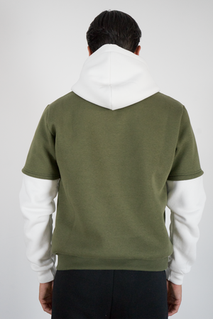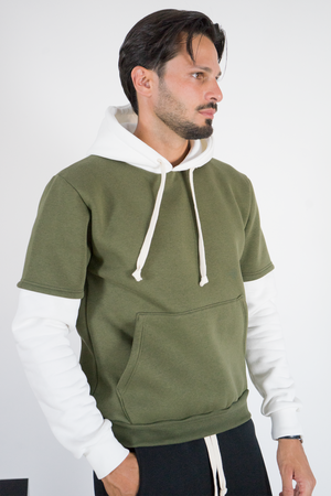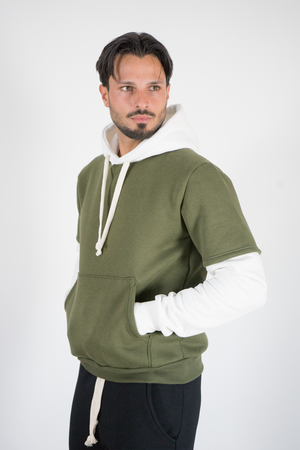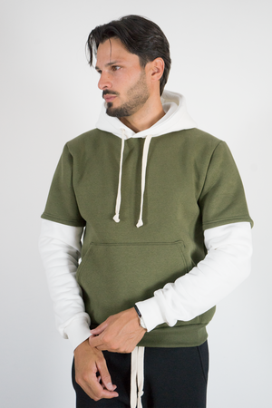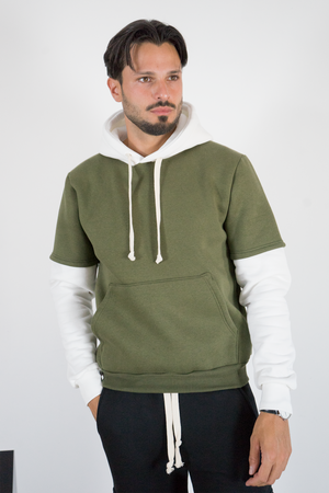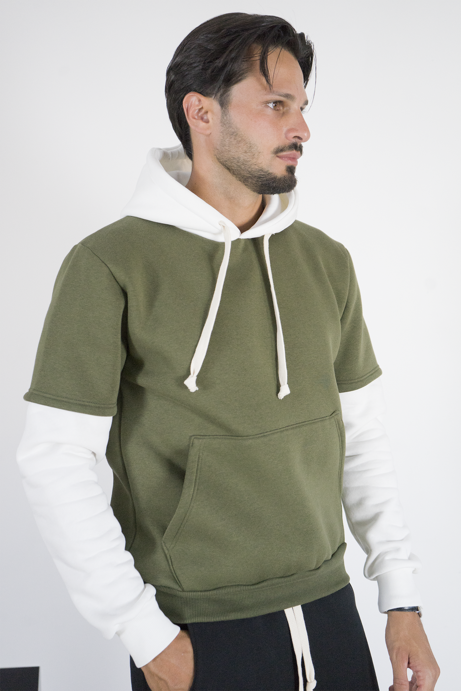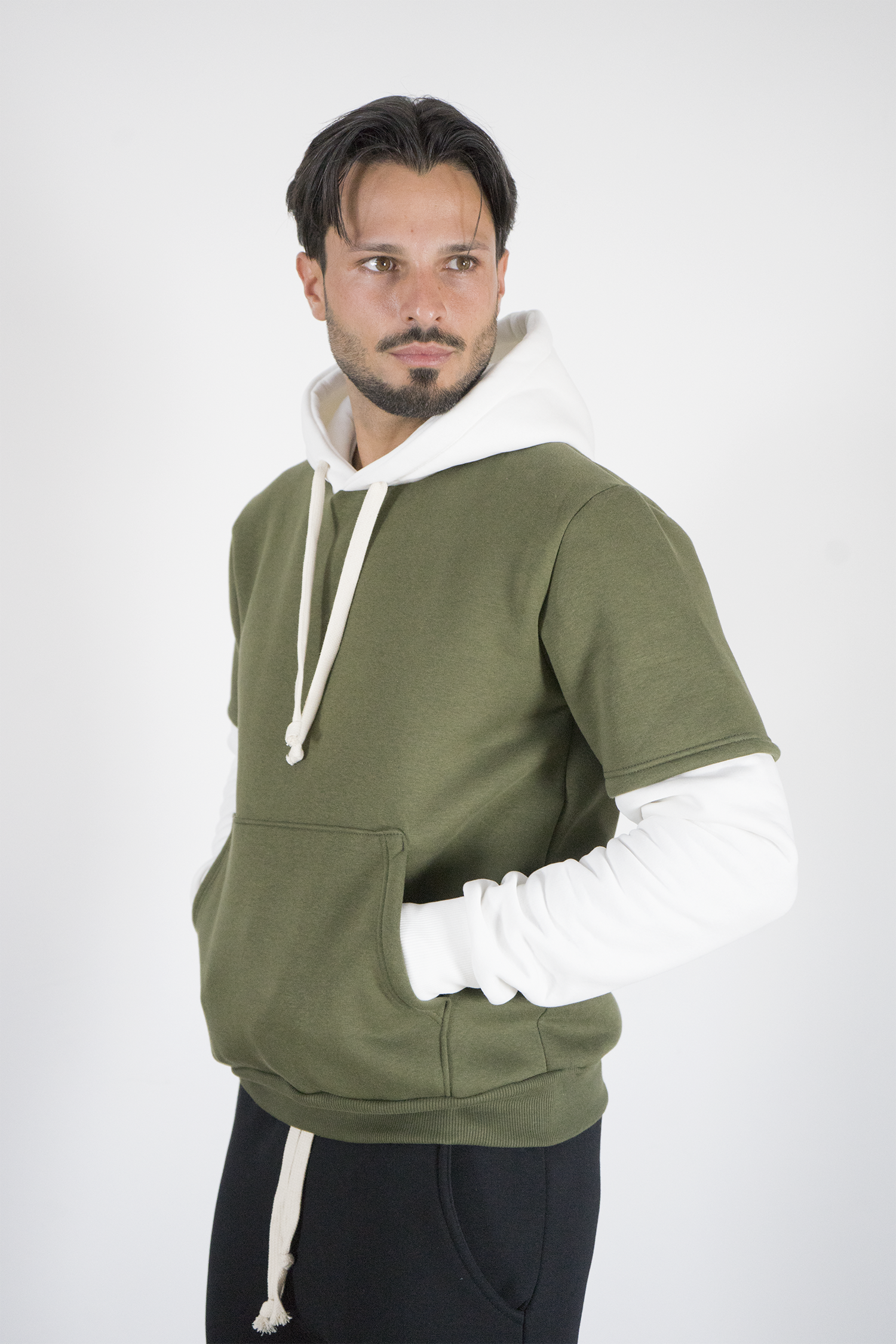 -Felpa uomo con cappuccio caratterizzata da design con doppia manica a contrasto. Realizzata in tessuto morbido e confortevole, presenta cappuccio con coulisse, tasca a marsupio frontale e vestibilità regolare. Uno stile unico che unisce casual e streetwear, ideale per outfit originali e di tendenza.