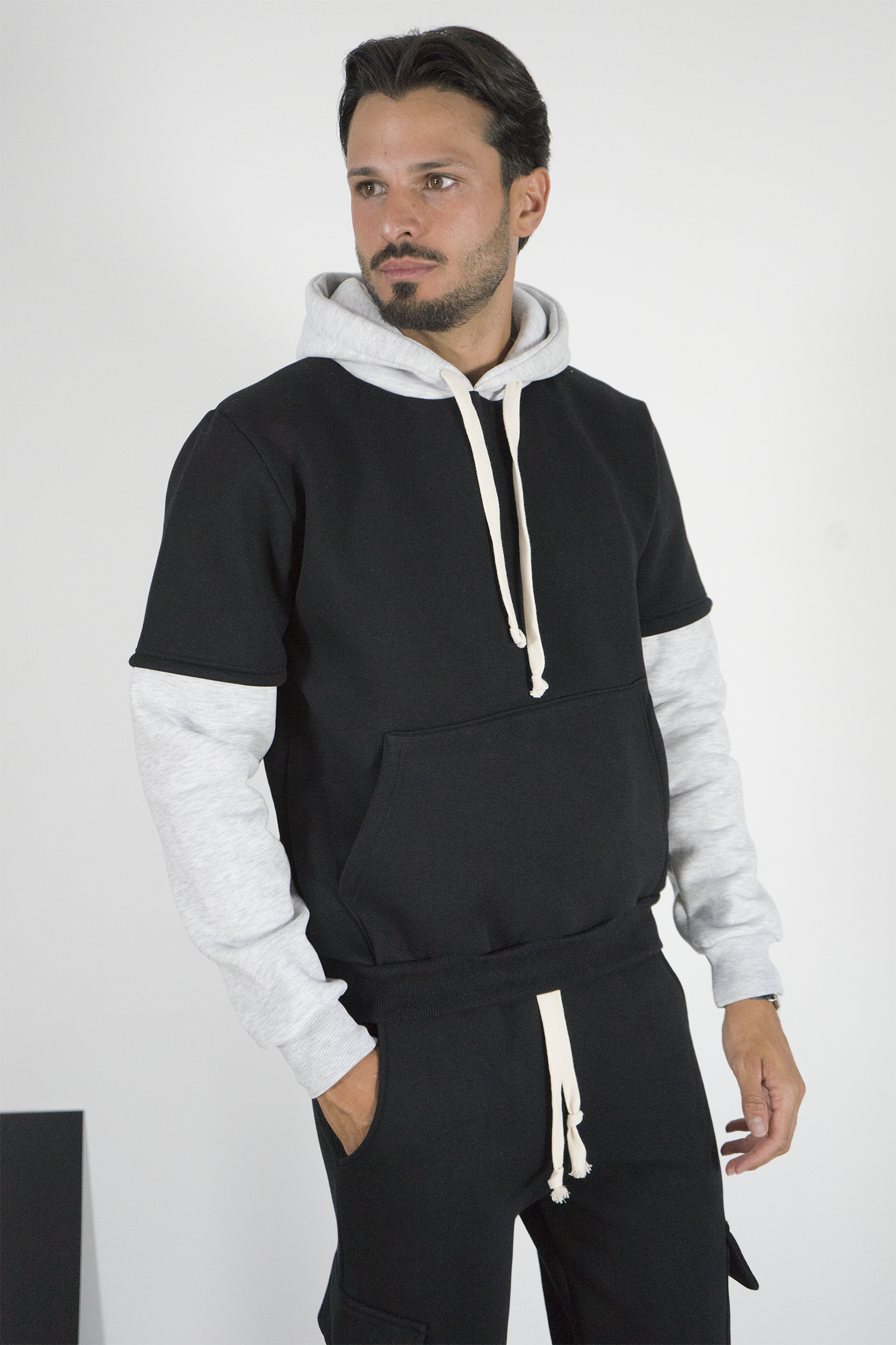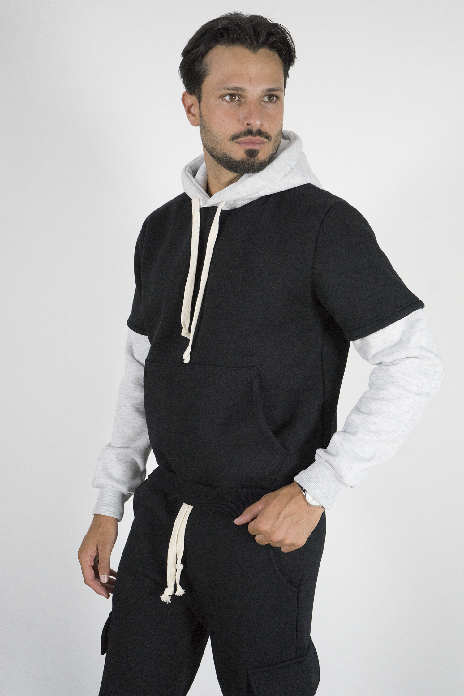 -Felpa uomo con cappuccio caratterizzata da design con doppia manica a contrasto. Realizzata in tessuto morbido e confortevole, presenta cappuccio con coulisse, tasca a marsupio frontale e vestibilità regolare. Uno stile unico che unisce casual e streetwear, ideale per outfit originali e di tendenza.
