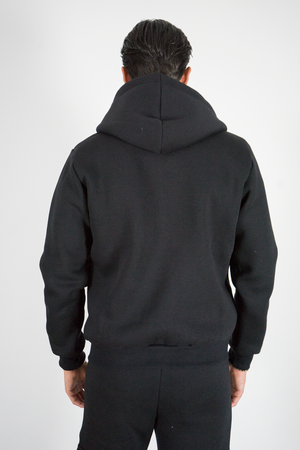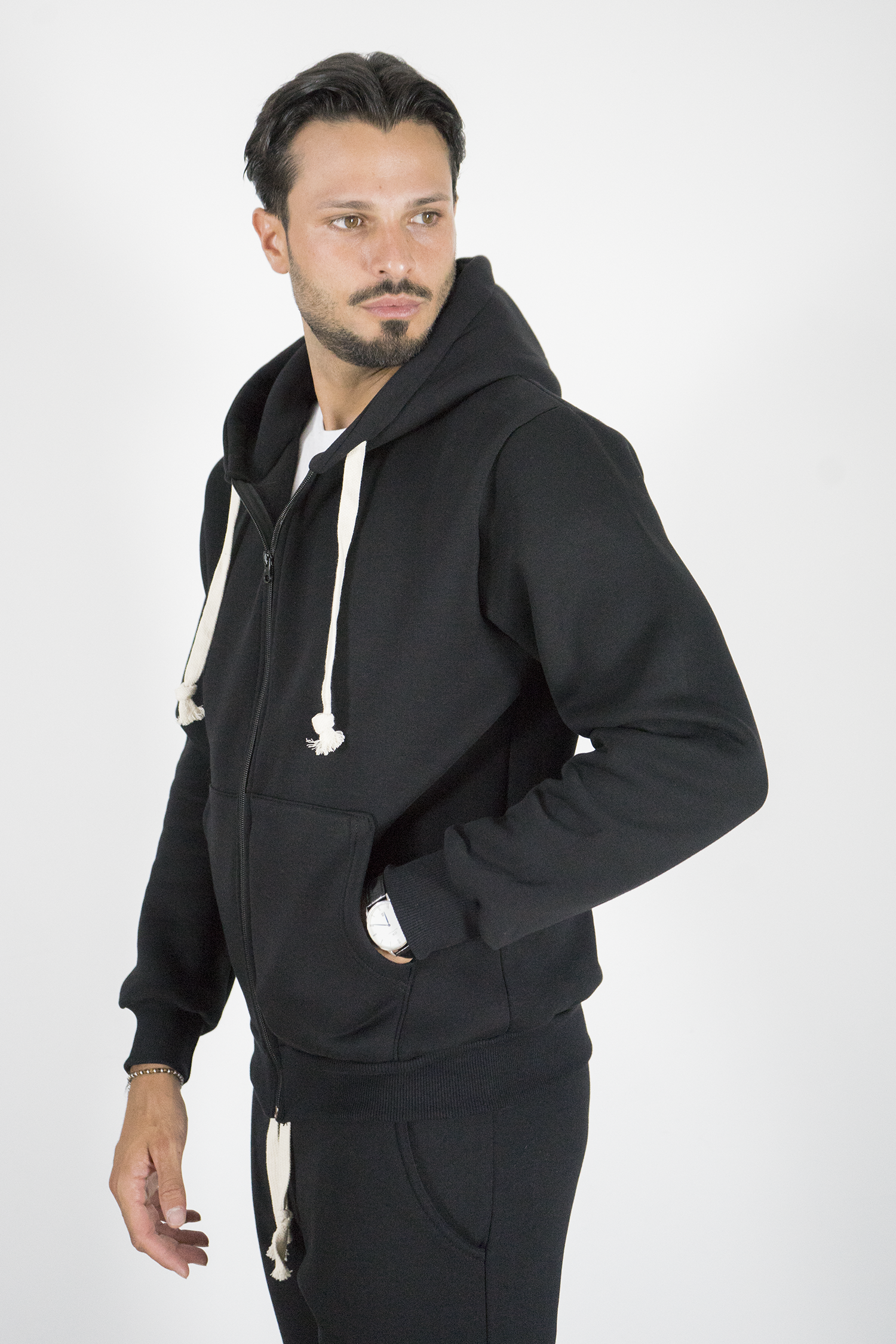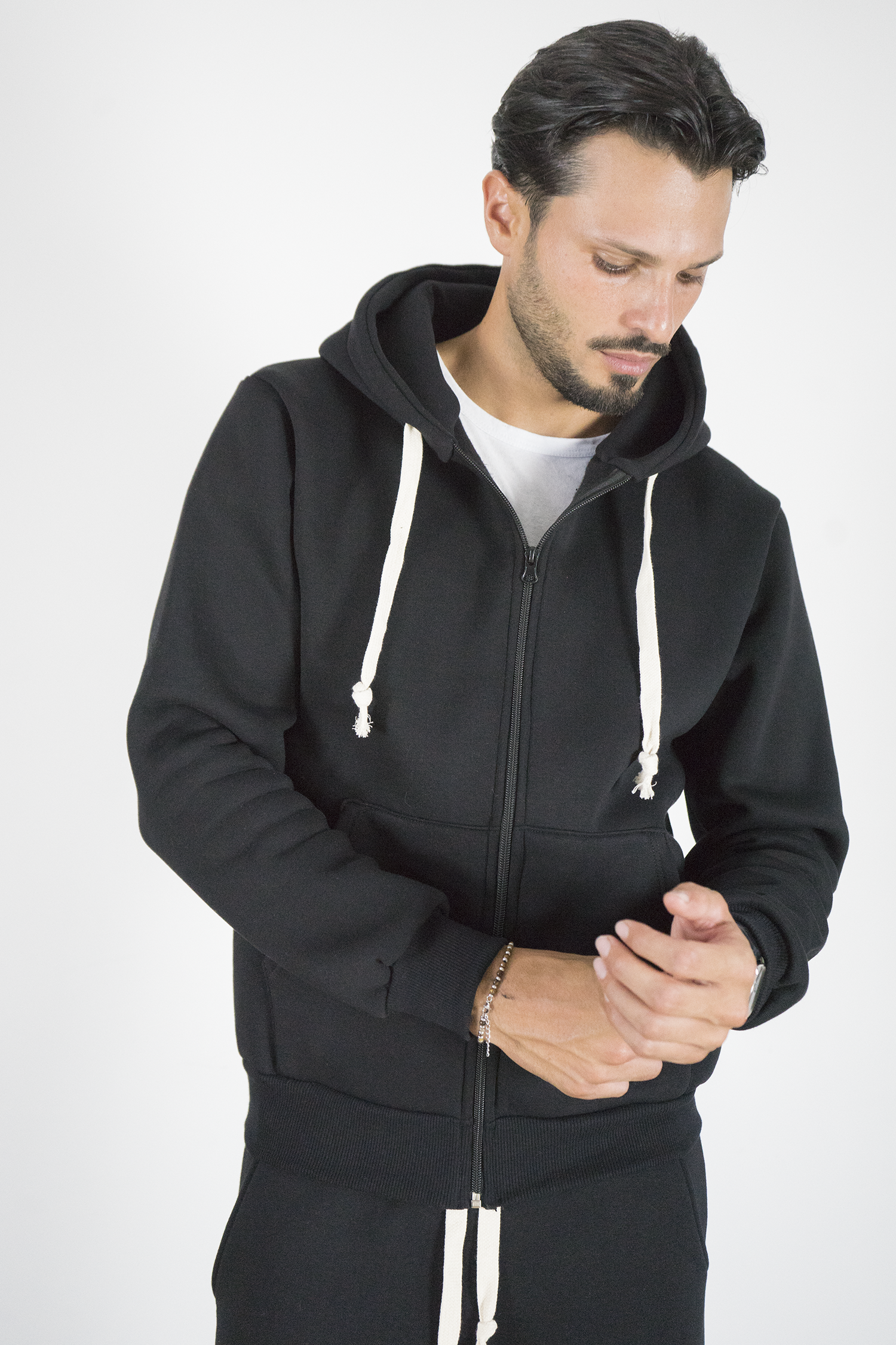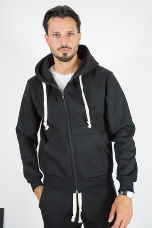 -Felpa uomo con cappuccio full zip in colore nero, caratterizzata da coulisse bianche a contrasto e tasche frontali. Realizzata in tessuto morbido e resistente, offre comfort e praticità per ogni occasione. Un capo essenziale dallo stile minimal, perfetto sia per outfit casual che streetwear.