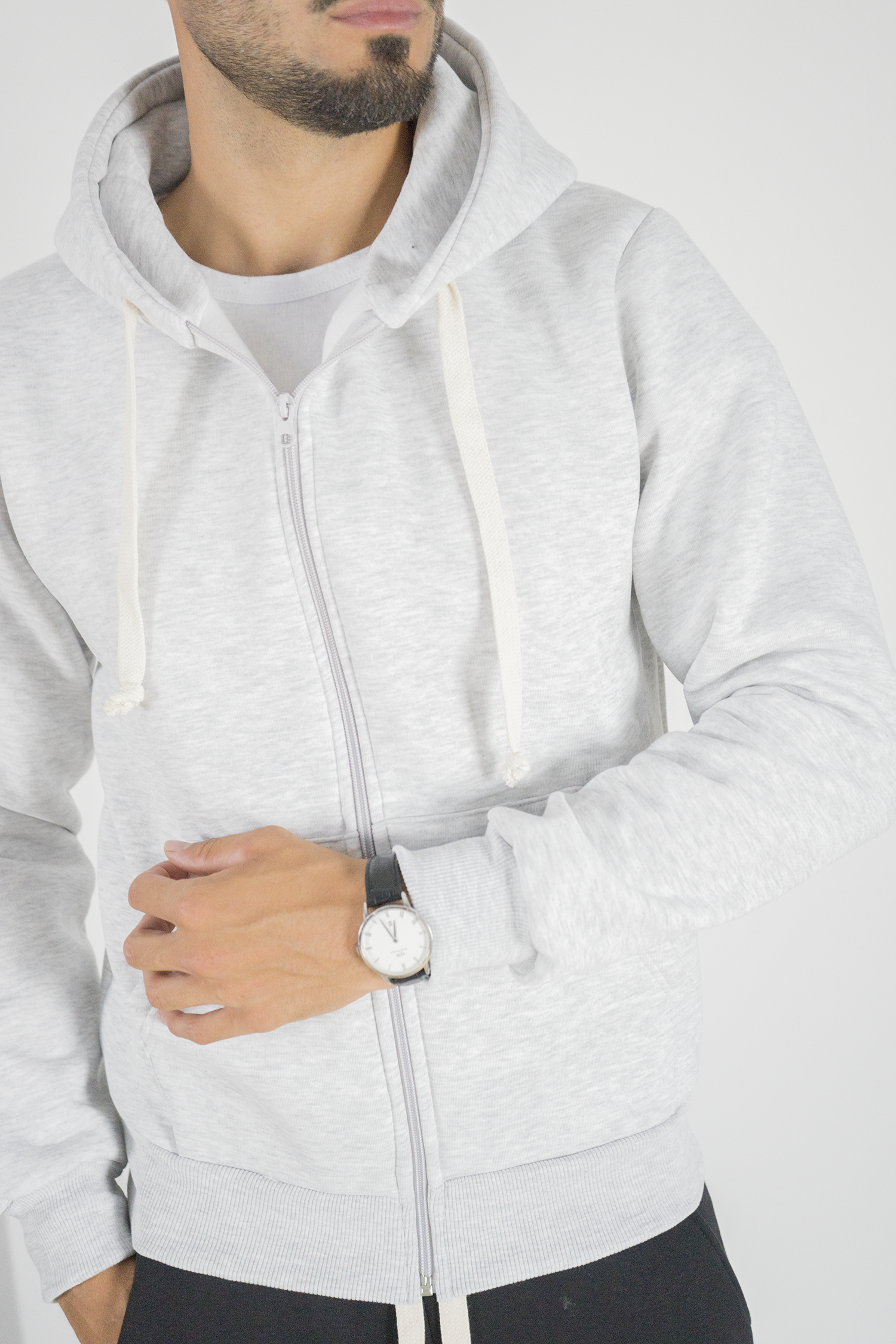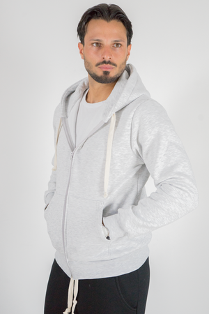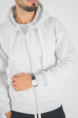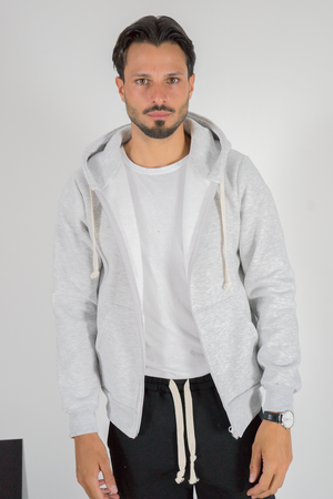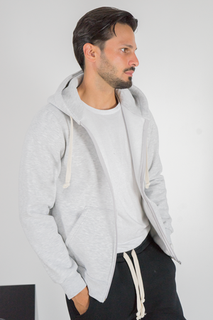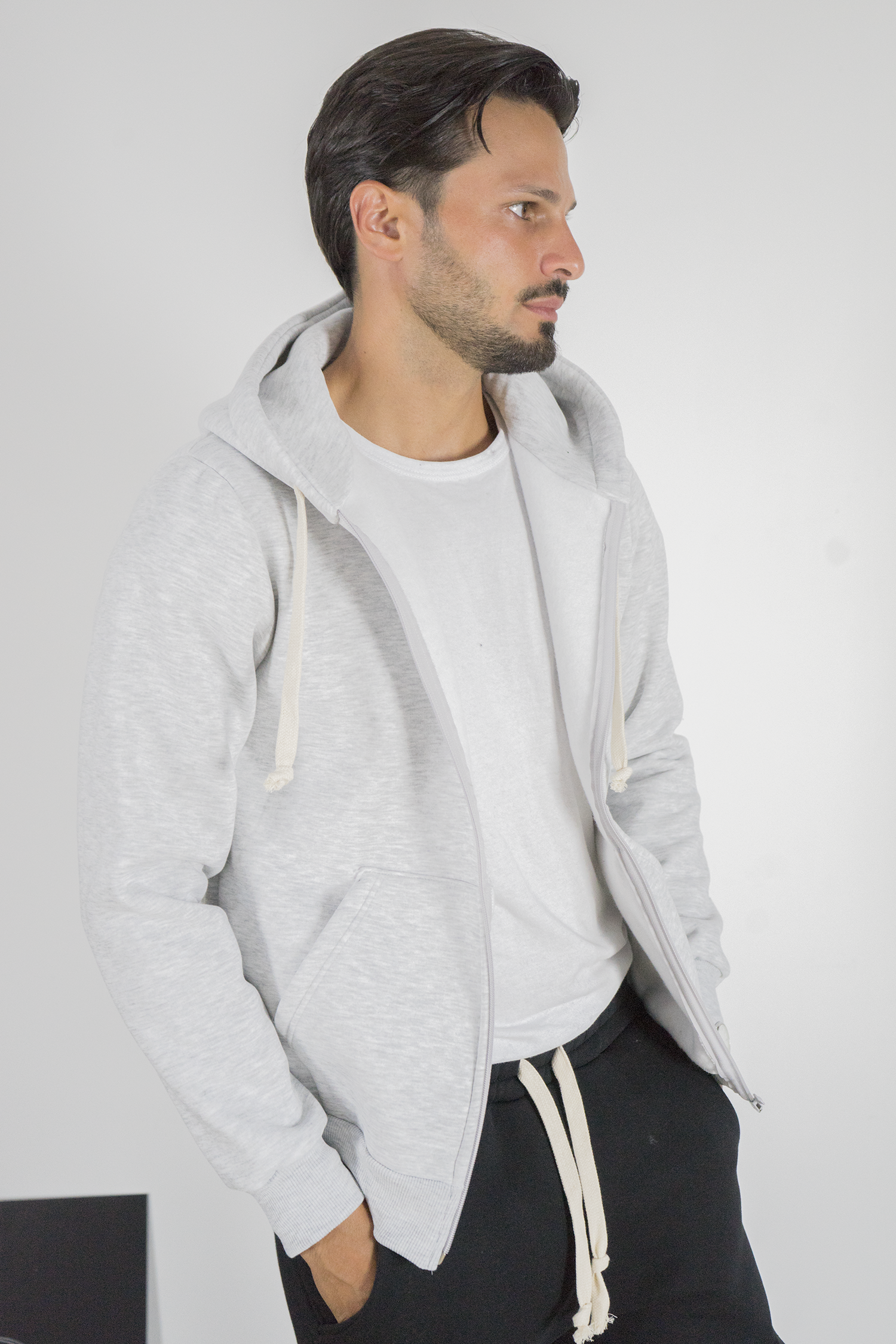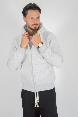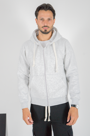 -Felpa uomo con cappuccio full zip in colore grigio , caratterizzata da coulisse bianche a contrasto e tasche frontali. Realizzata in tessuto morbido e resistente, offre comfort e praticità per ogni occasione. Un capo essenziale dallo stile minimal, perfetto sia per outfit casual che streetwear.