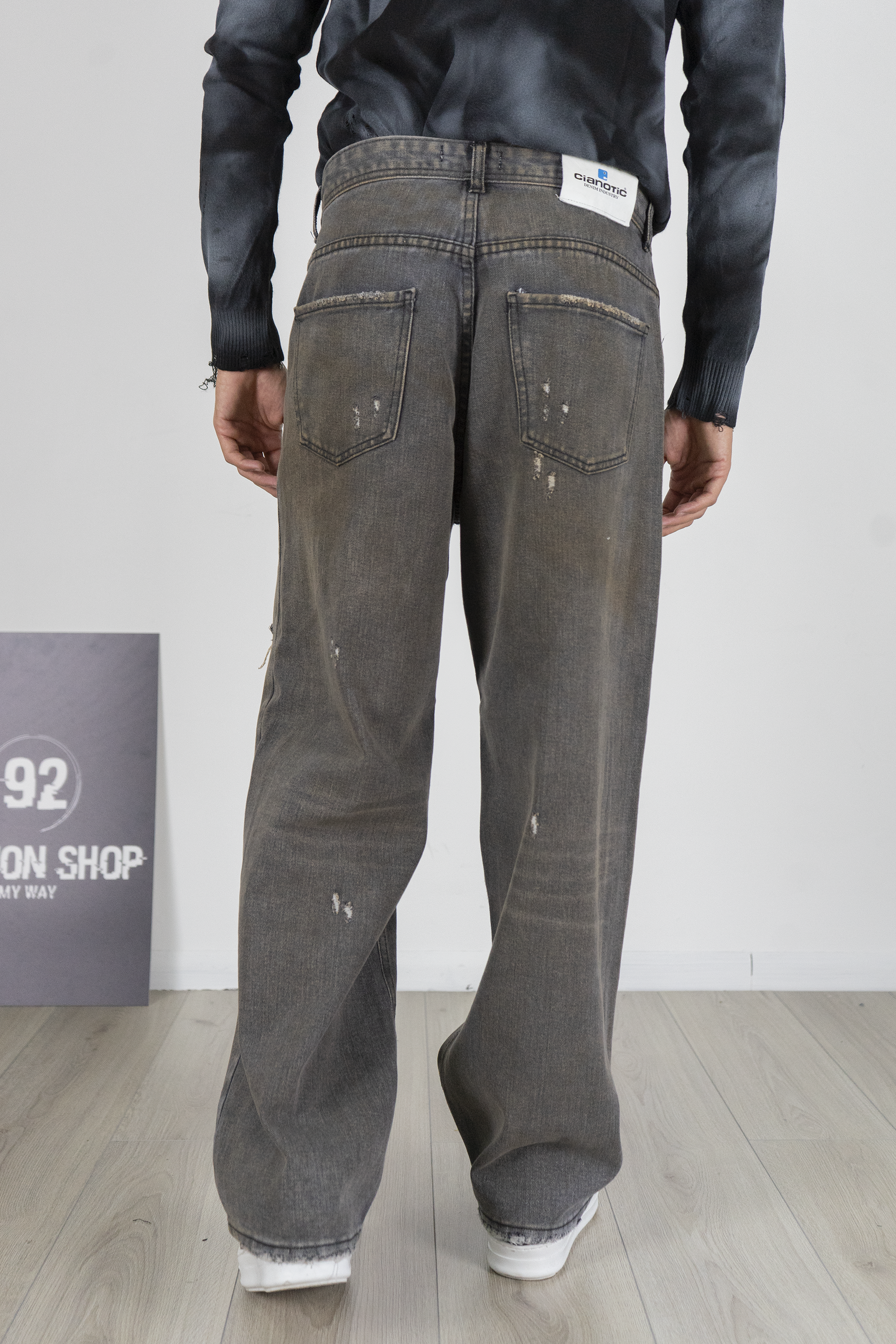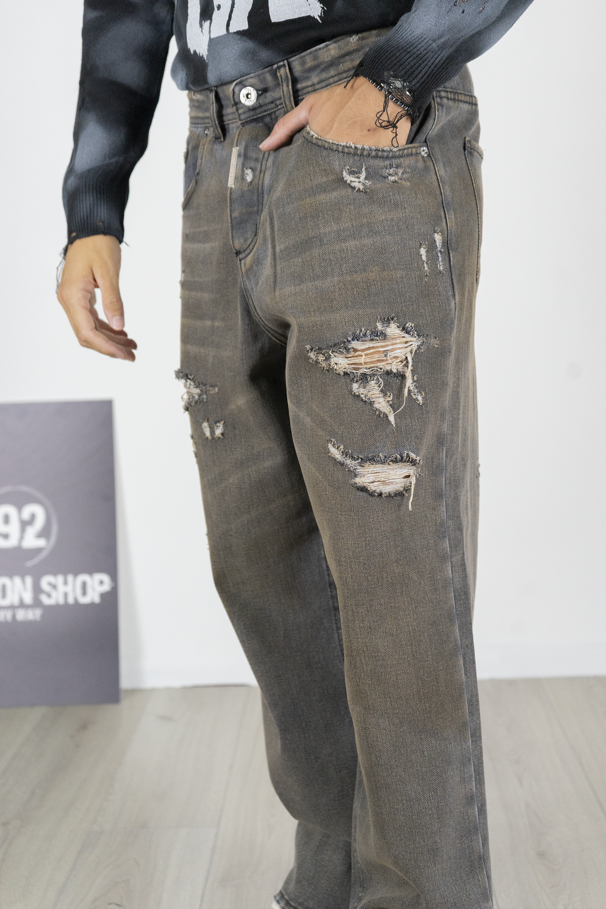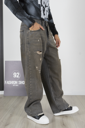 -Jeans uomo grigio con vestibilità Baggy fit e dettagli strappati effetto destroyed. Realizzato in denim resistente ma confortevole, dona un look urbano deciso e di carattere. Il taglio ampio lo rende perfetto per outfit streetwear moderni, da abbinare a t-shirt o maglioni stampati con sneakers per uno stile trendy e grintoso.