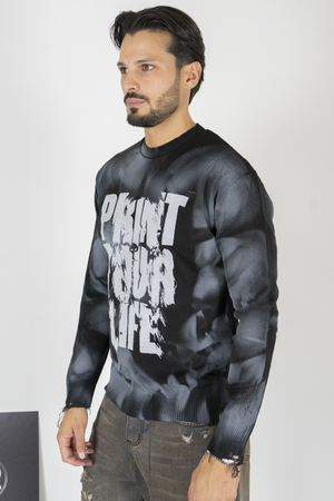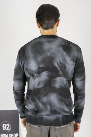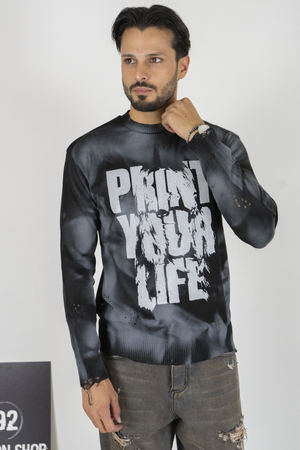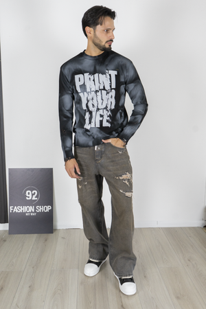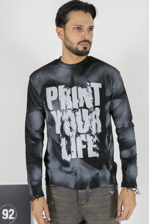 -Maglione uomo nero con effetto tie-dye grigio e scritta frontale “Print Your Life” in bianco. Realizzato in maglia morbida con dettagli destroyed, è il capo ideale per chi ama lo stile streetwear con carattere. Versatile e d’impatto, si abbina facilmente a jeans slim o cargo con sneakers per un look urbano e contemporaneo.