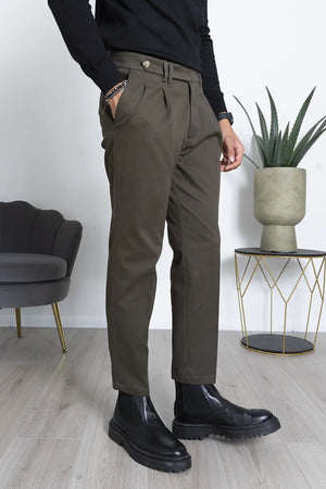 -Dettagli: Questo pantalone casual-elegante è realizzato in un raffinato tessuto gabardine, che conferisce un aspetto sofisticato e una vestibilità confortevole. Presenta un'abbottonatura laterale che aggiunge un tocco distintivo al design, mentre le pinces frontali offrono una silhouette elegante e slanciata. Il modello capri, con la sua lunghezza che arriva appena sopra la caviglia, rende questo pantalone perfetto per un look versatile che può essere facilmente abbinato sia a una camicia formale che a una maglietta casual. Ideale per occasioni che richiedono un equilibrio tra stile e comodità, questo pantalone rappresenta un must-have nel guardaroba moderno.