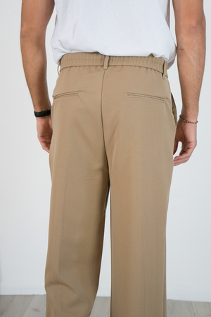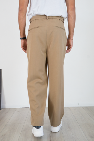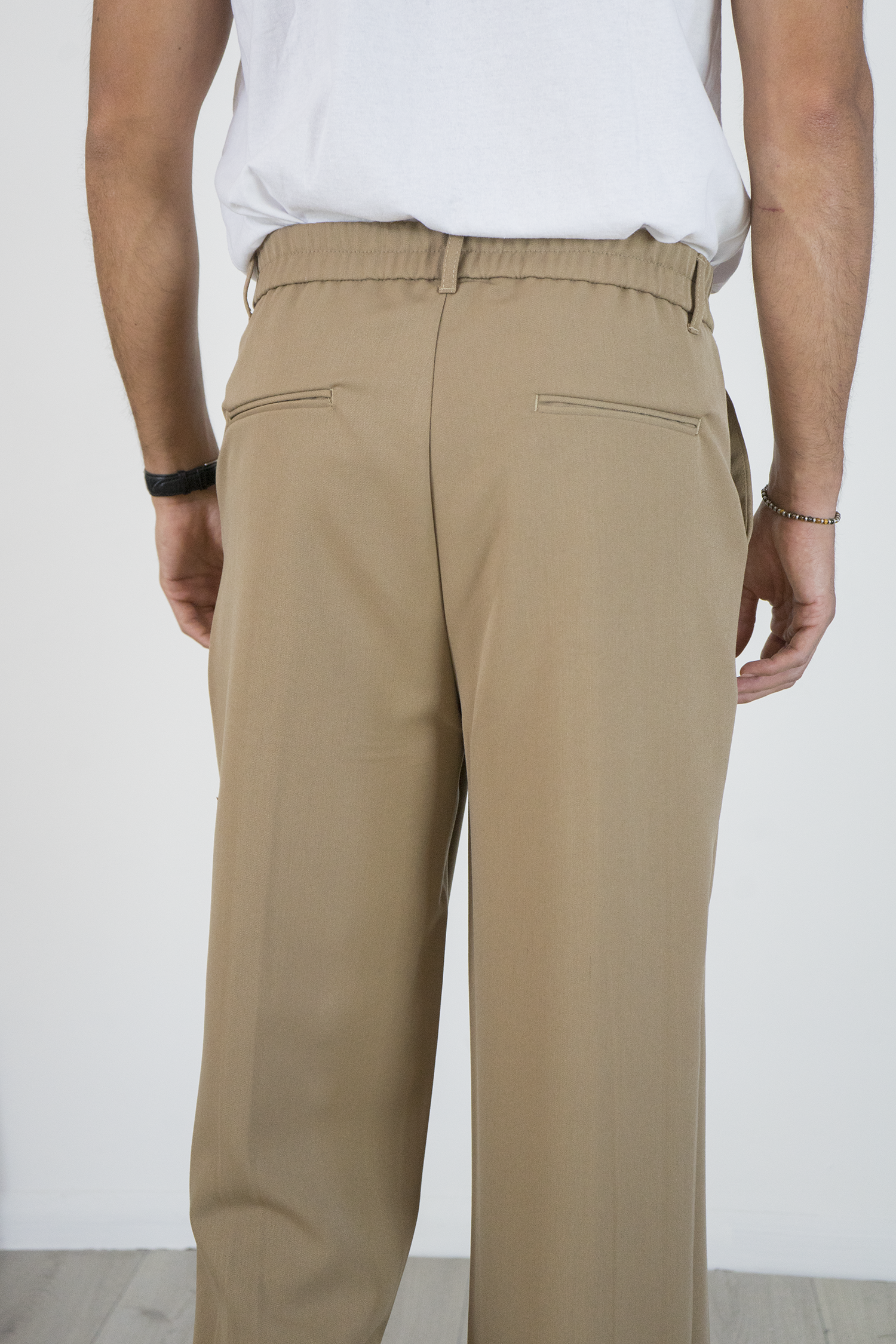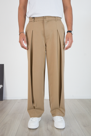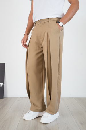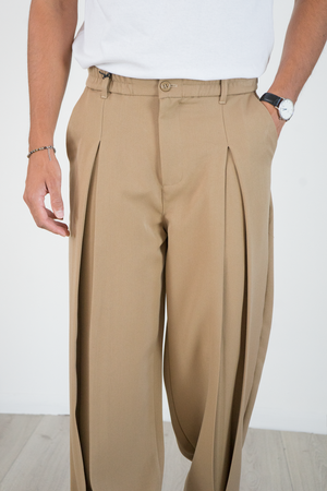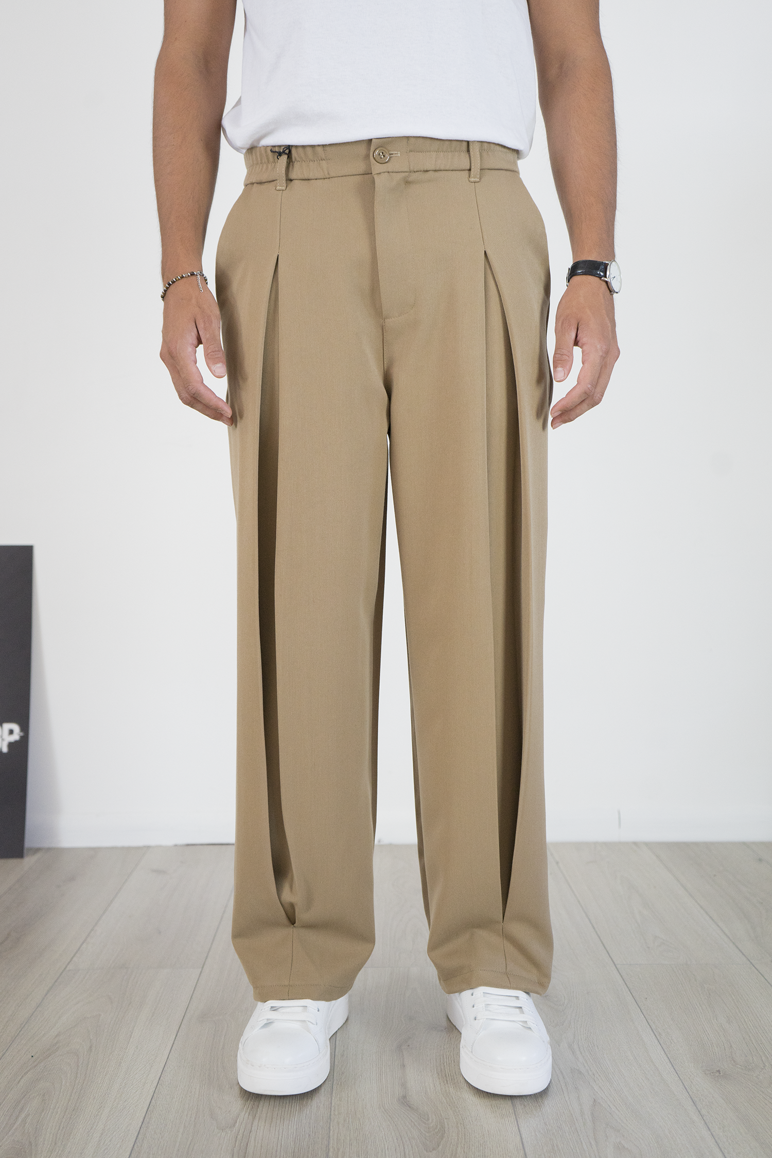 -Pantalone uomo elegante con fondo ampio e pinces frontali che donano volume e stile. Realizzato in tessuto morbido e confortevole, presenta vita elasticizzata con bottone e passanti per cintura, perfetto per un look moderno e raffinato. Ideale da indossare con camicia o t-shirt basic per un outfit casual chic o semi-formale.