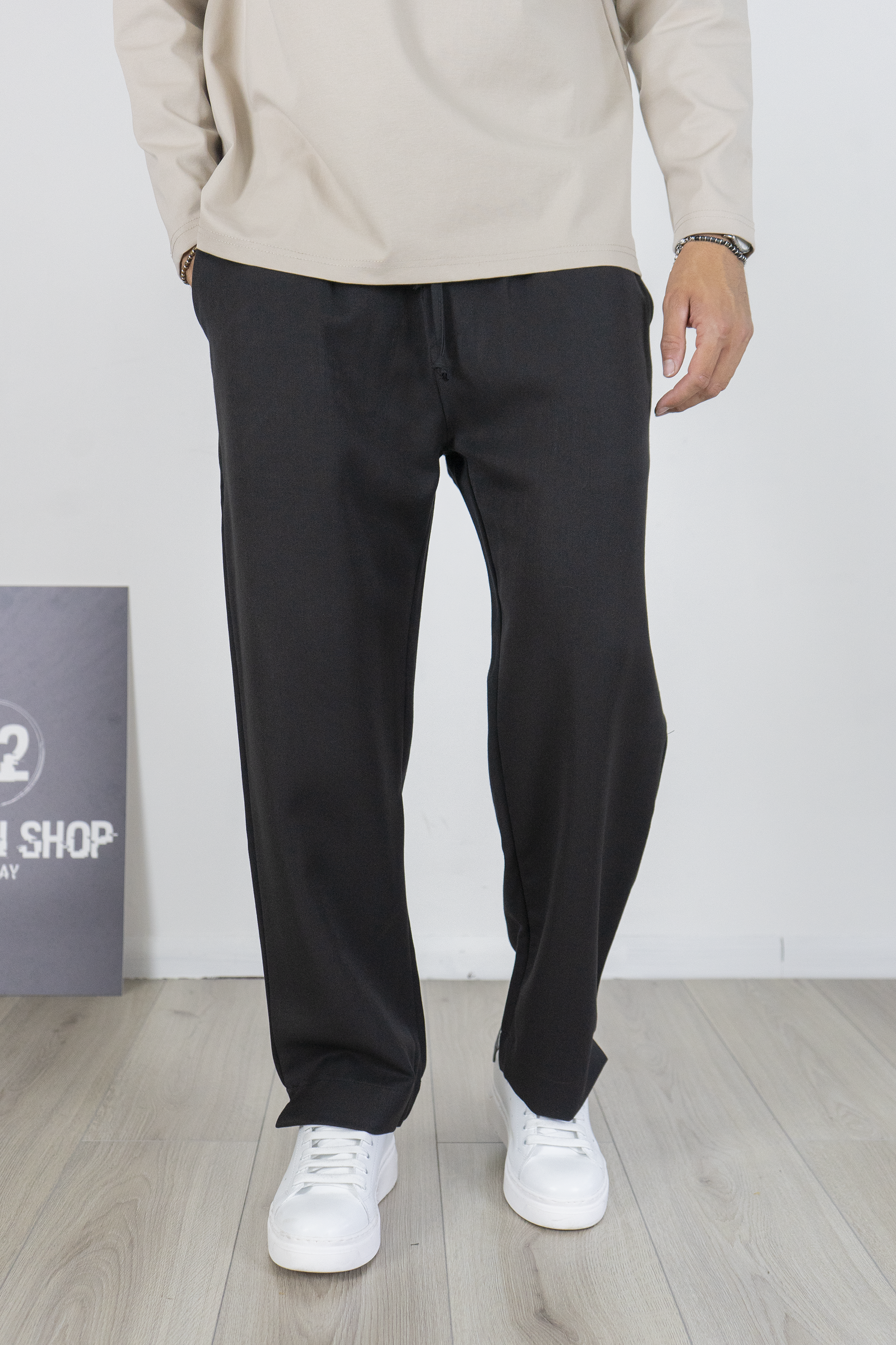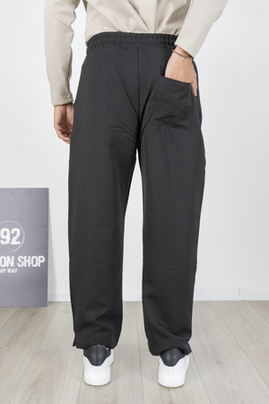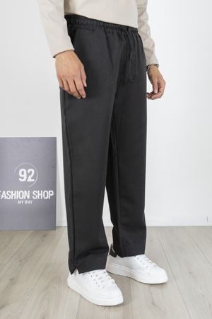 -Pantalone uomo in stile palazzo con fondo largo e vita jogger regolabile tramite coulisse. Realizzato in tessuto fluido e confortevole, unisce eleganza e praticità in un unico capo. Il design moderno con gamba ampia lo rende perfetto per look streetwear sofisticati, ma anche per outfit casual chic. Facile da abbinare con sneakers o mocassini per un risultato versatile e sempre attuale.