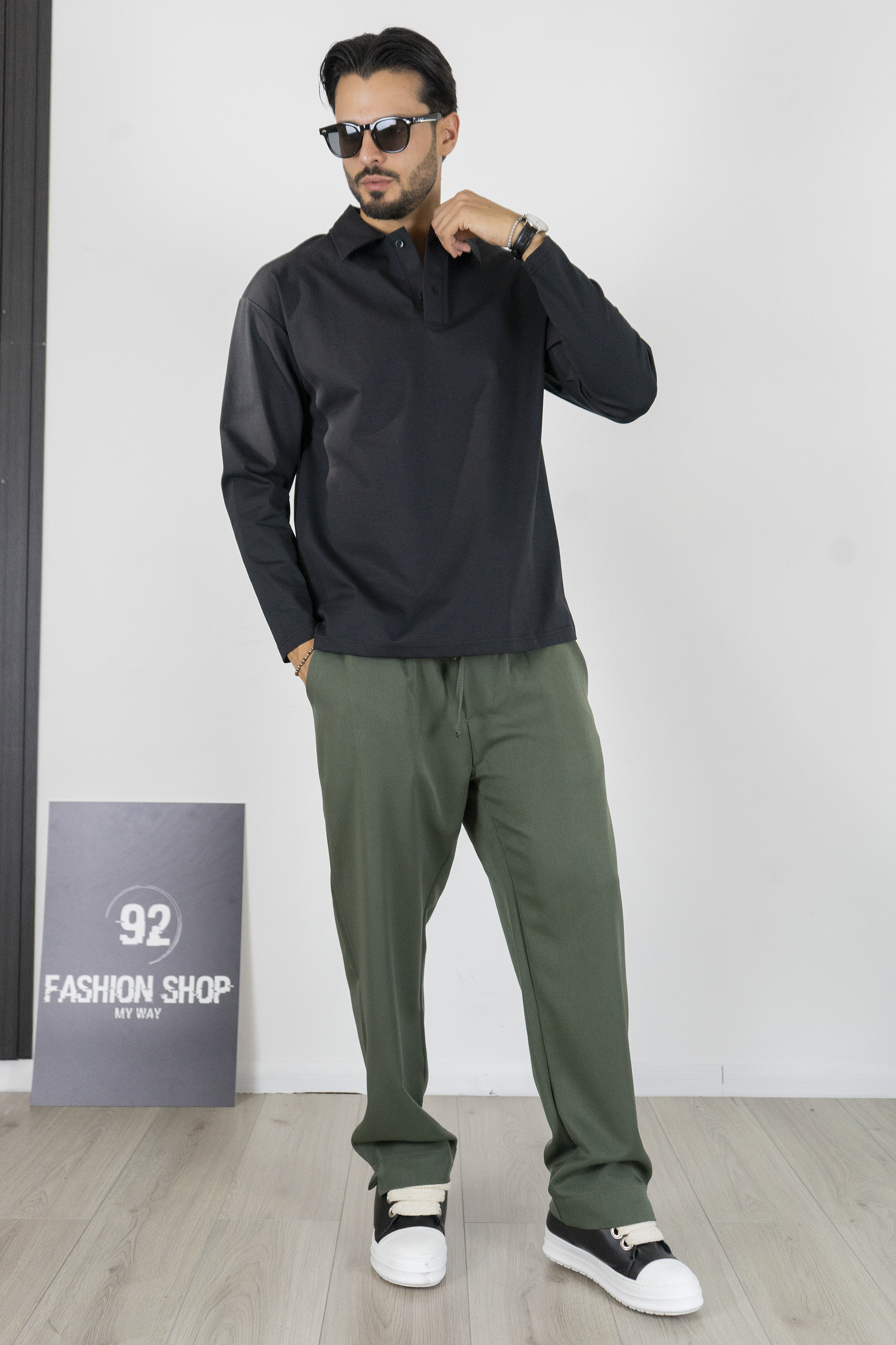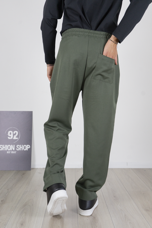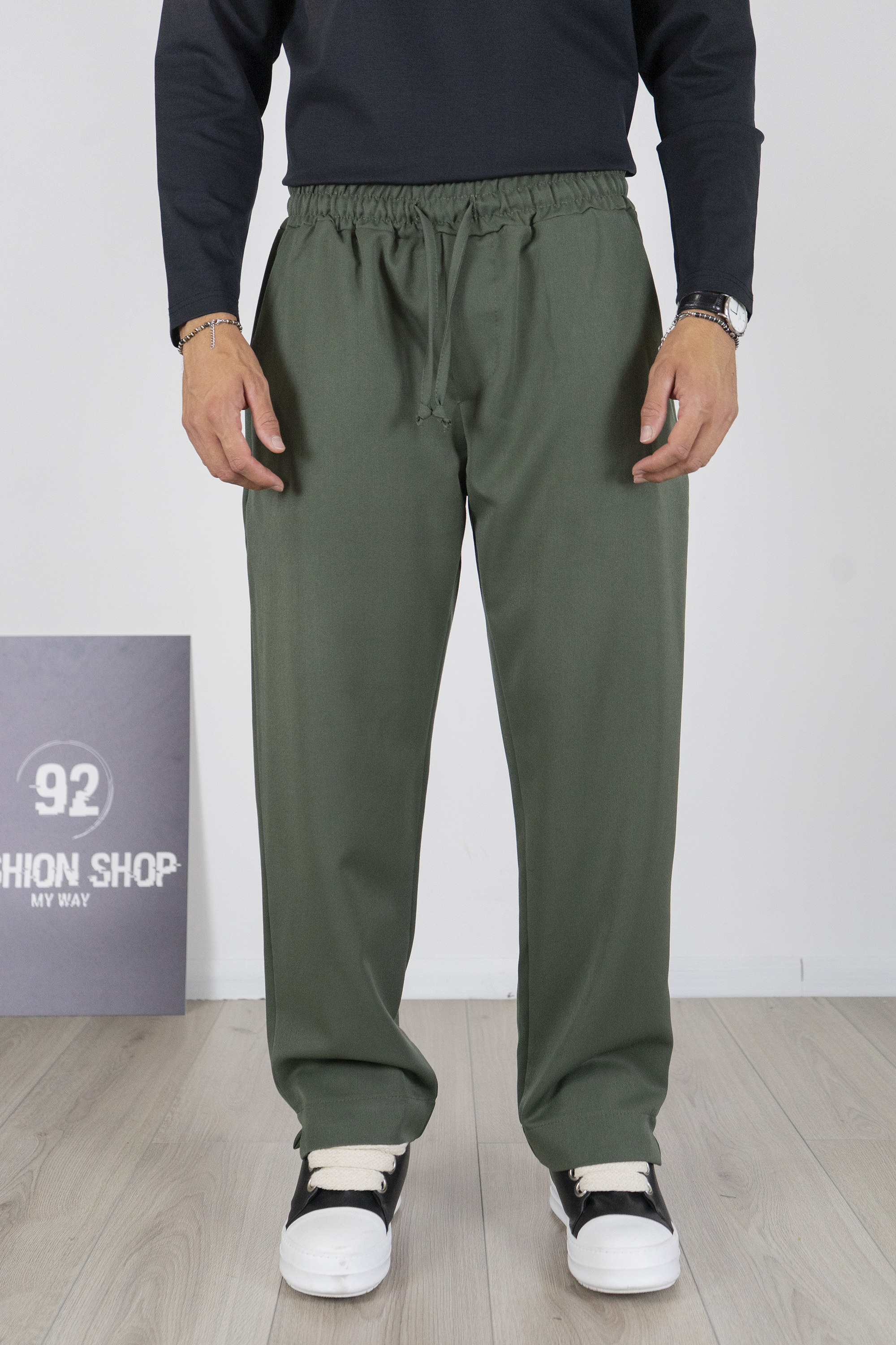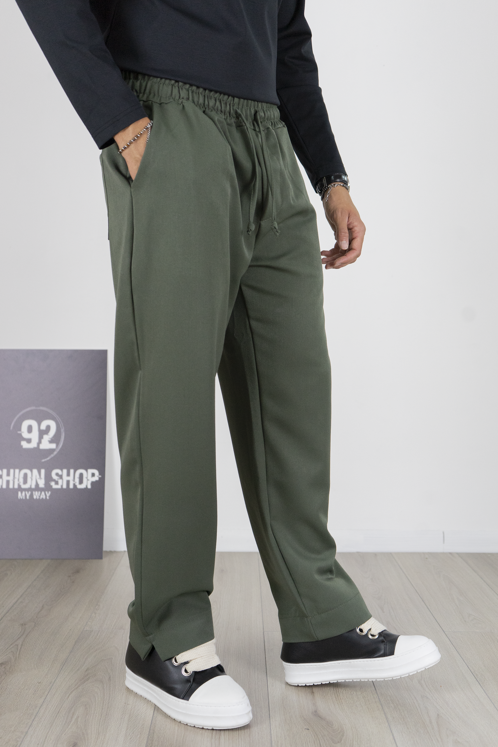 -Pantalone uomo in stile palazzo con fondo largo e vita jogger regolabile tramite coulisse. Realizzato in tessuto fluido e confortevole, unisce eleganza e praticità in un unico capo. Il design moderno con gamba ampia lo rende perfetto per look streetwear sofisticati, ma anche per outfit casual chic. Facile da abbinare con sneakers o mocassini per un risultato versatile e sempre attuale.