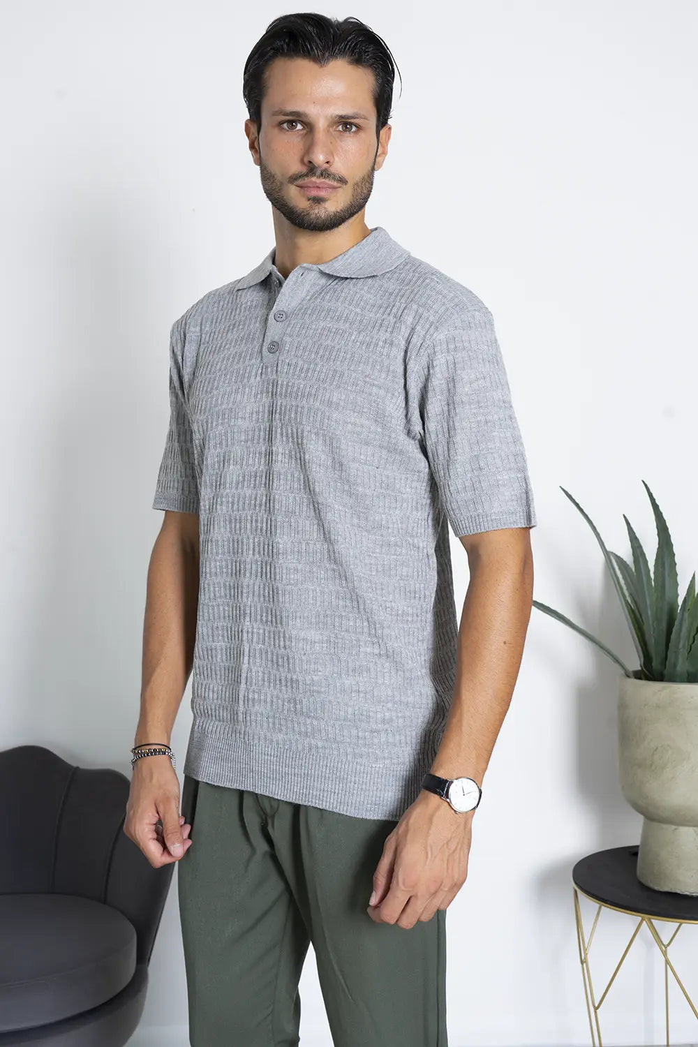- Design Classico e Versatile: La trama lavorata a maglia conferisce un tocco distintivo, mentre il colletto a tre bottoni aggiunge eleganza al design, rendendola adatta sia per look casual che più sofisticati.