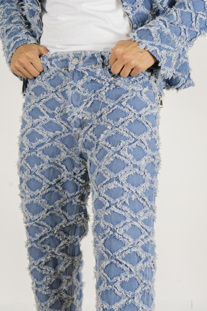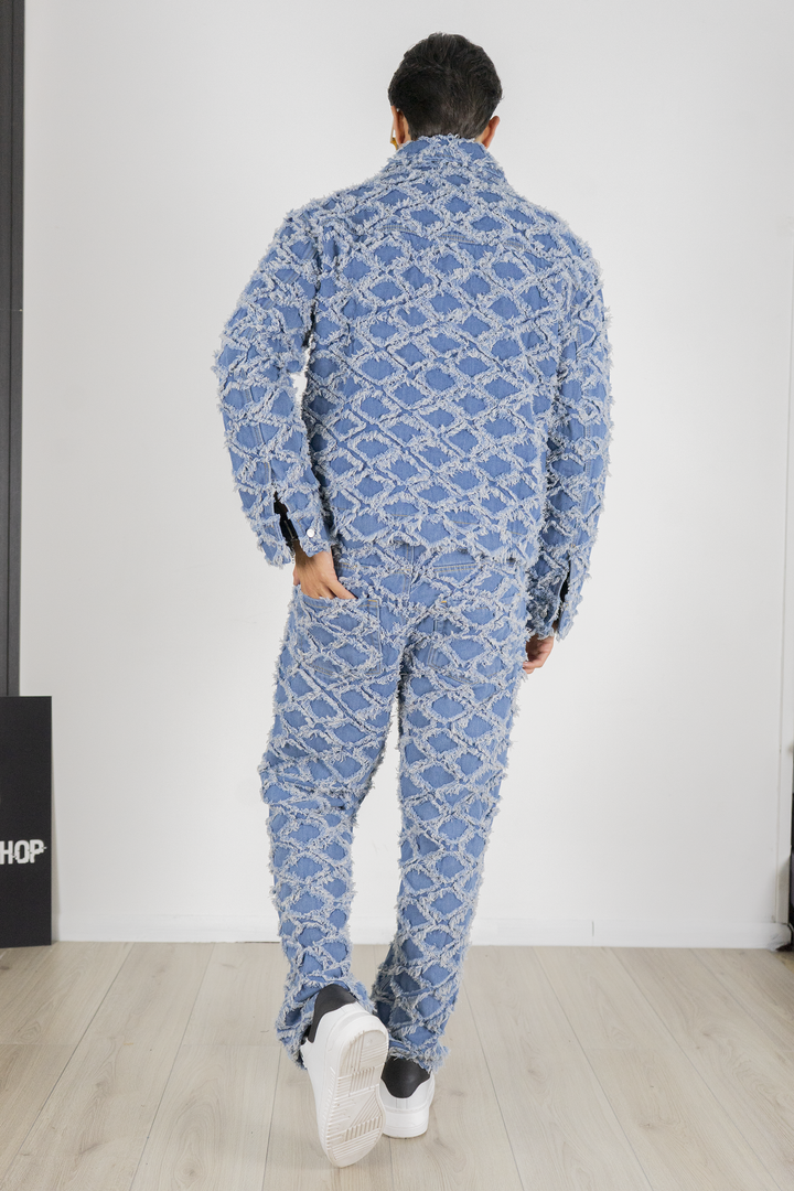 Le pantalon assorti, également avec des détails à franges, suit le même design unique que la veste, pour un look complet qui ne passe pas inaperçu.