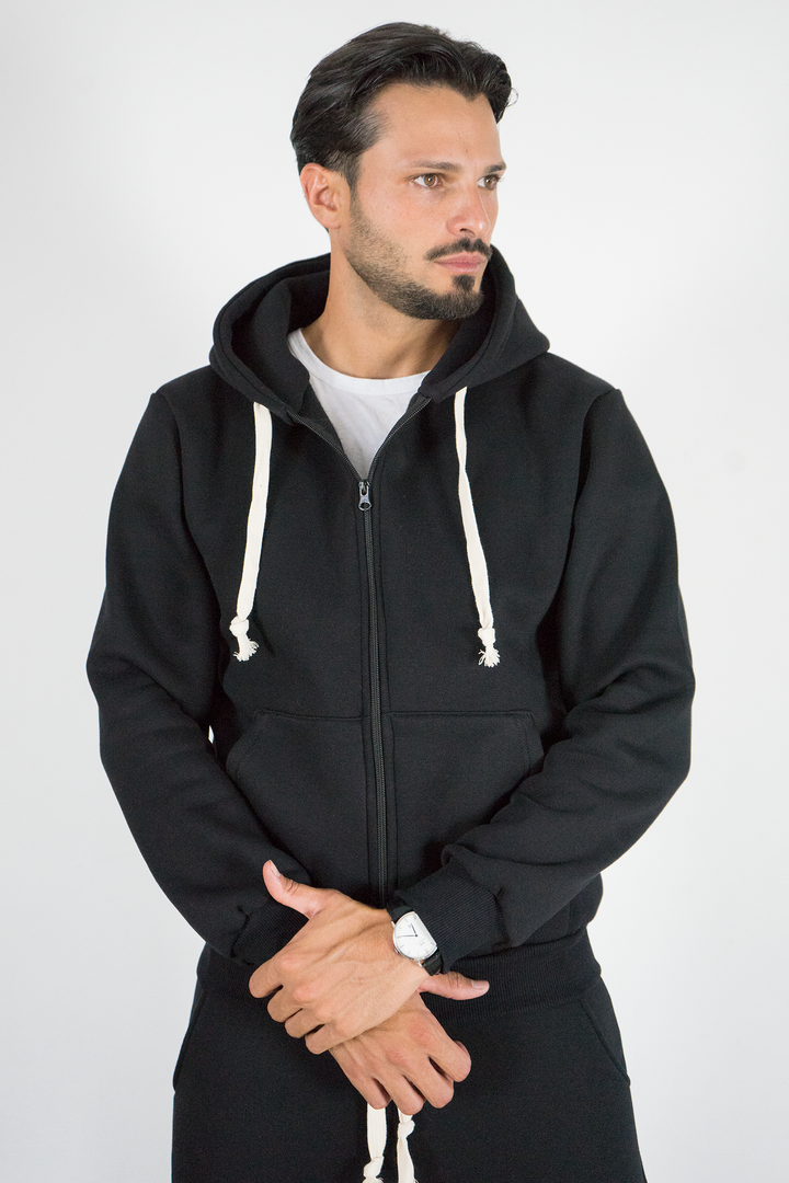 -Felpa uomo con cappuccio full zip in colore nero, caratterizzata da coulisse bianche a contrasto e tasche frontali. Realizzata in tessuto morbido e resistente, offre comfort e praticità per ogni occasione. Un capo essenziale dallo stile minimal, perfetto sia per outfit casual che streetwear.