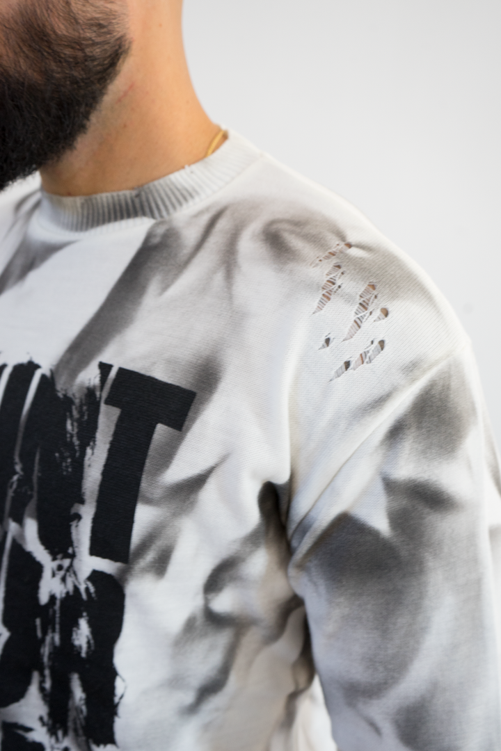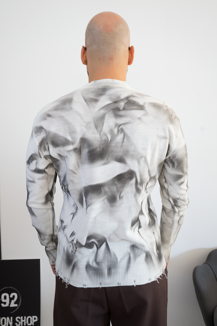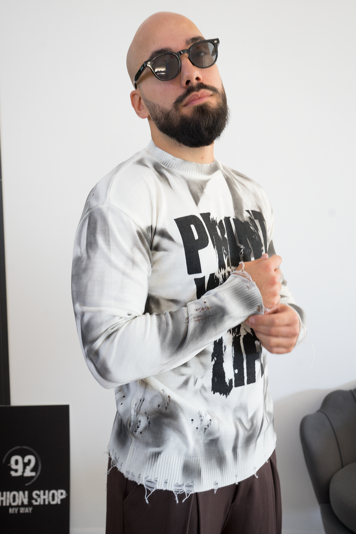 -Maglione uomo Bianca con effetto tie-dye grigio e scritta frontale “Print Your Life” in Nero. Realizzato in maglia morbida con dettagli destroyed, è il capo ideale per chi ama lo stile streetwear con carattere. Versatile e d’impatto, si abbina facilmente a jeans slim o cargo con sneakers per un look urbano e contemporaneo.