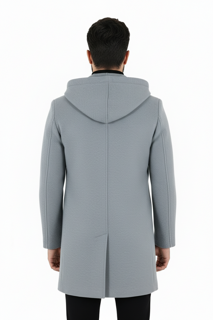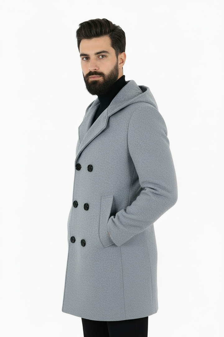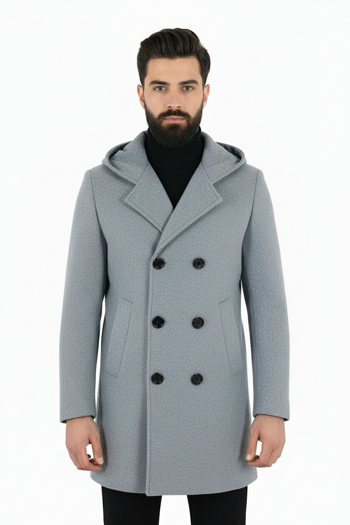 Realizzato in Italia, il cappotto è dotato di un cappuccio che aggiunge un tocco di praticità senza compromettere l'eleganza. La chiusura a doppiopetto conferisce un aspetto formale e strutturato, mentre le tasche laterali offrono comfort e funzionalità.