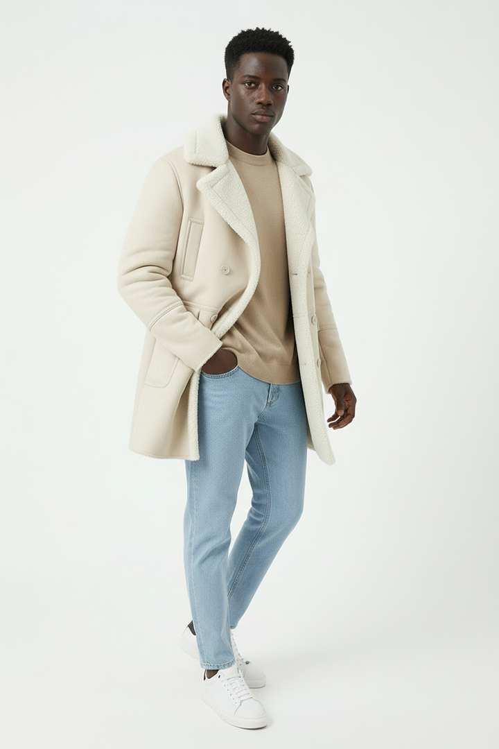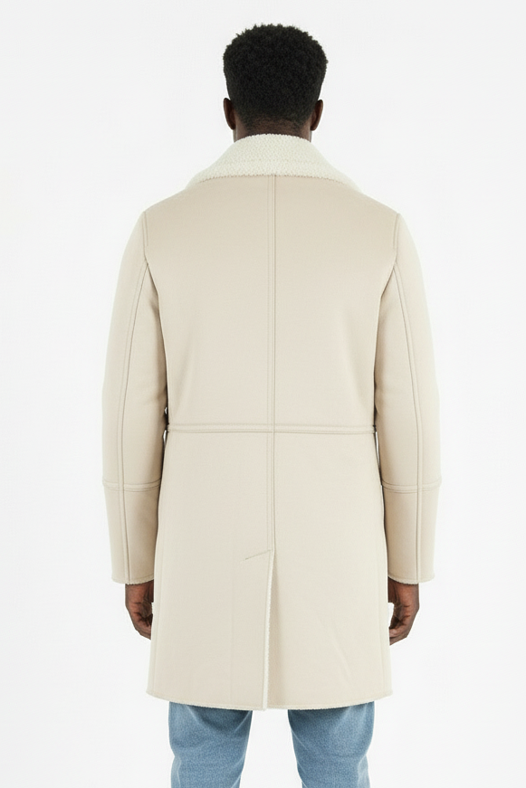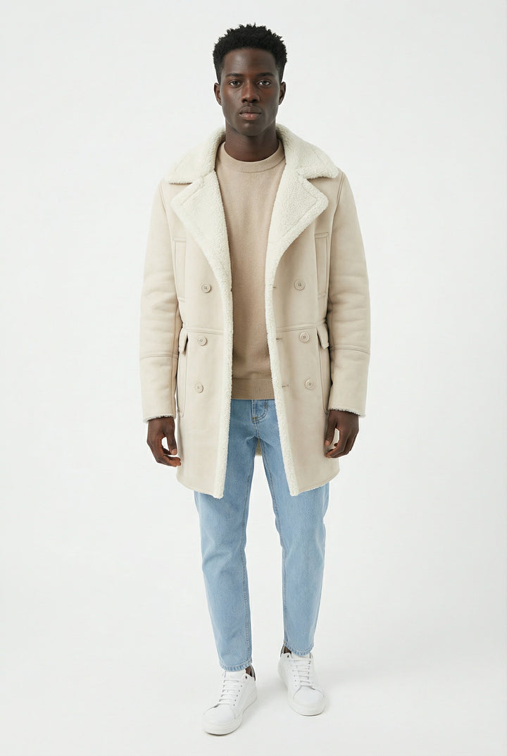 -Cappotto da uomo realizzato in tessuto effetto montone color beige. Il modello presenta una chiusura a doppio petto con bottoni tono su tono e un interno foderato in pelliccia sintetica morbida, ideale per garantire calore e comfort durante i mesi invernali. Il design classico è arricchito da un colletto ampio e tasche laterali pratiche e funzionali. Perfetto per completare outfit sia casual che formali, donando un tocco di stile intramontabile.