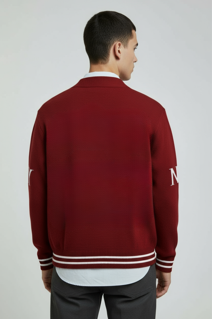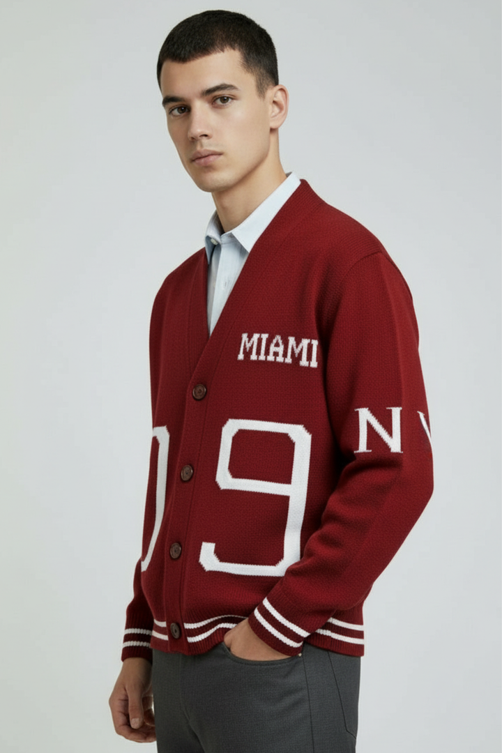 Cardigan uomo in maglia con stile college americano, caratterizzato da dettagli a contrasto e scritta “MIAMI 09” sul fronte.