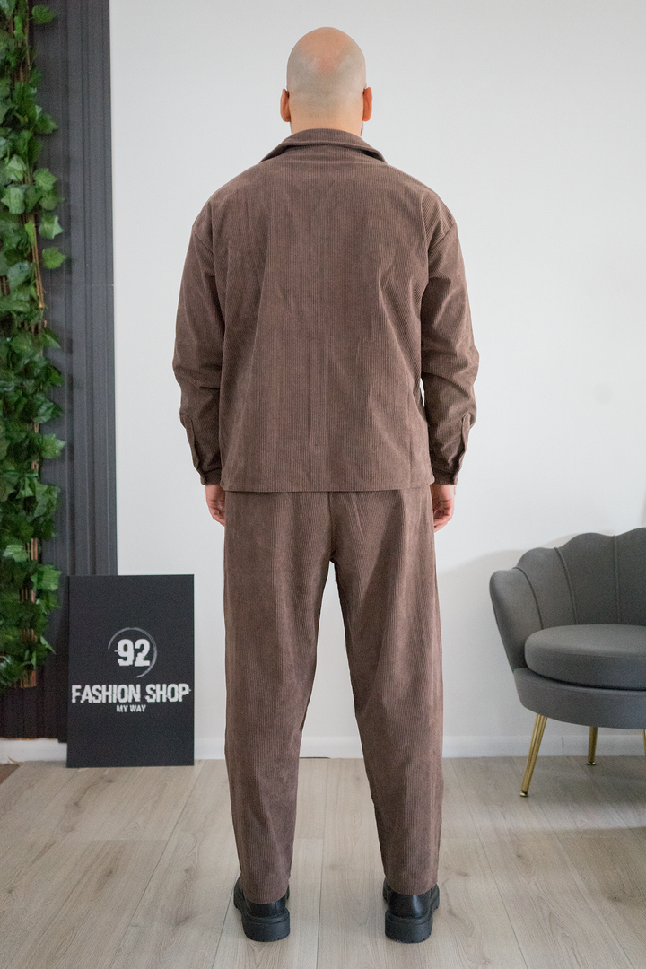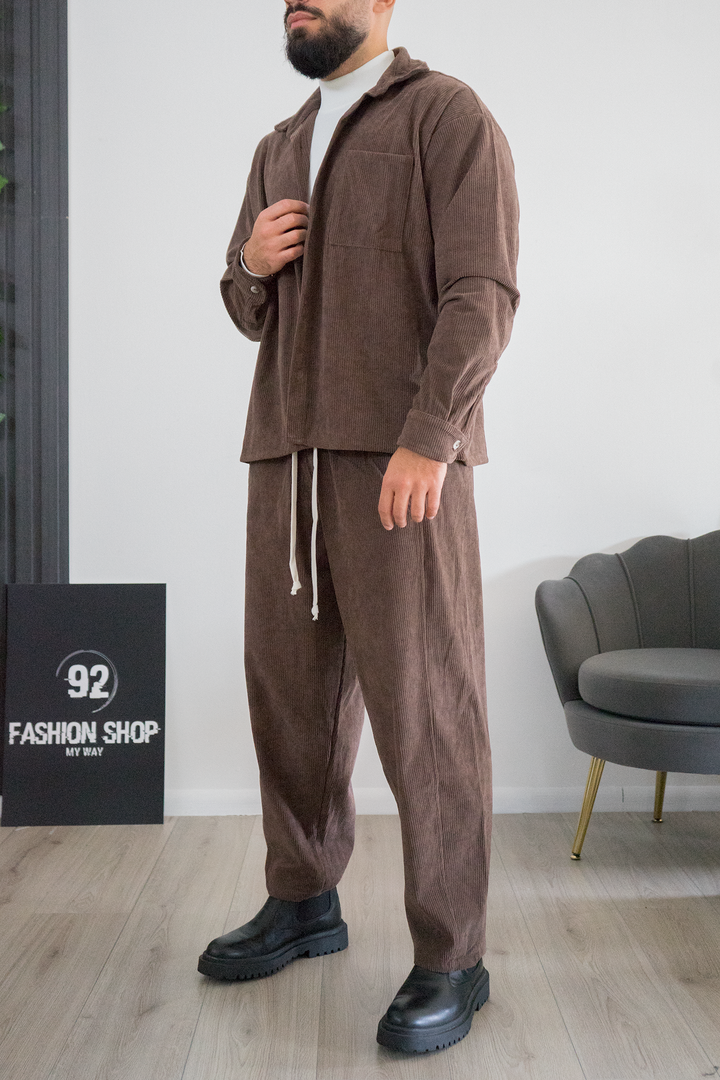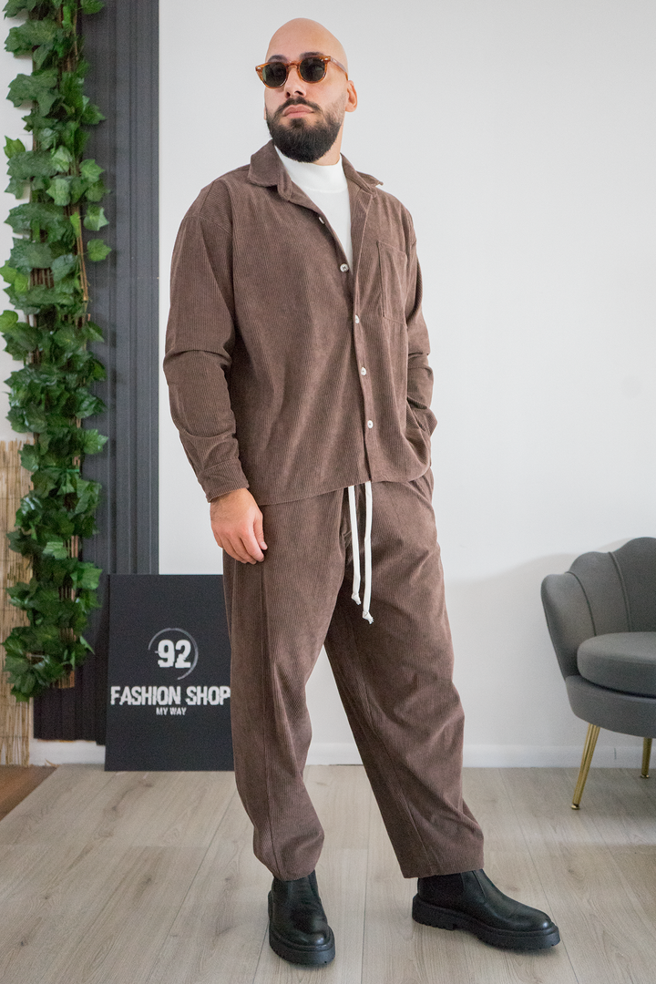 -Completo uomo realizzato in velluto a coste morbido, composto da camicia con bottoni e pantalone con coulisse regolabile.