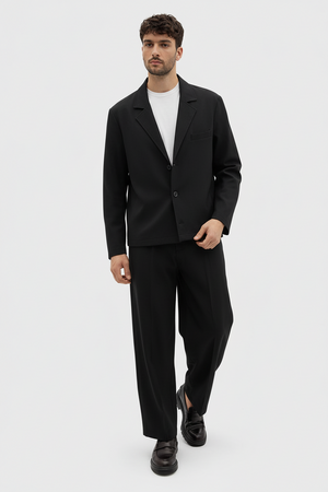Giacca: Design monopetto a 3 bottoni con rever a lancia, vestibilità boxy leggermente over e lunghezza accorciata (crop) per un look d'avanguardia.