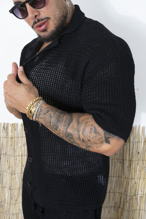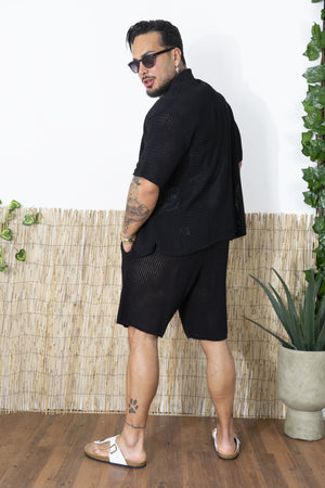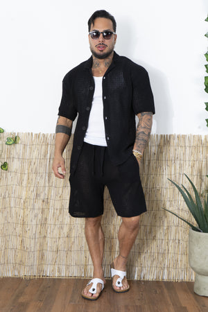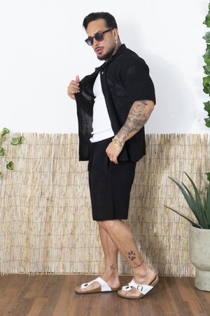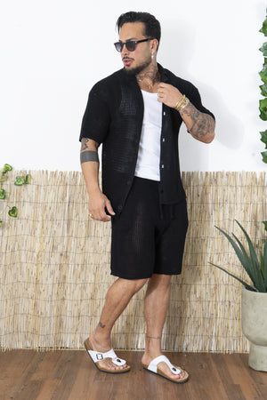 -Porta lo stile estivo a un altro livello con questo completo traforato da uomo, composto da camicia a maniche corte e pantaloncini coordinati. Realizzato in una maglia lavorata traforata, questo set è perfetto per chi cerca un look fresco, moderno e rilassato, senza rinunciare al comfort.