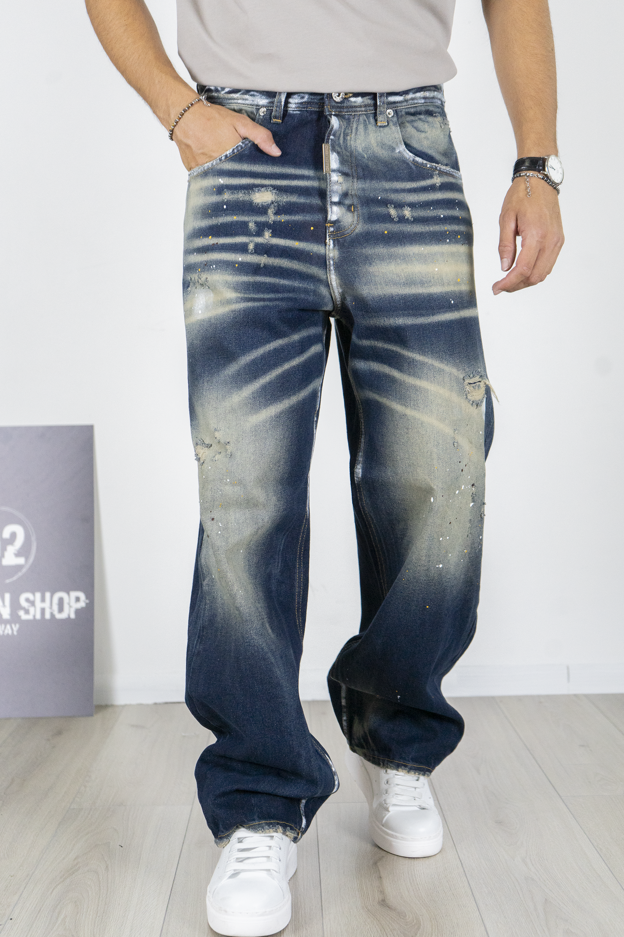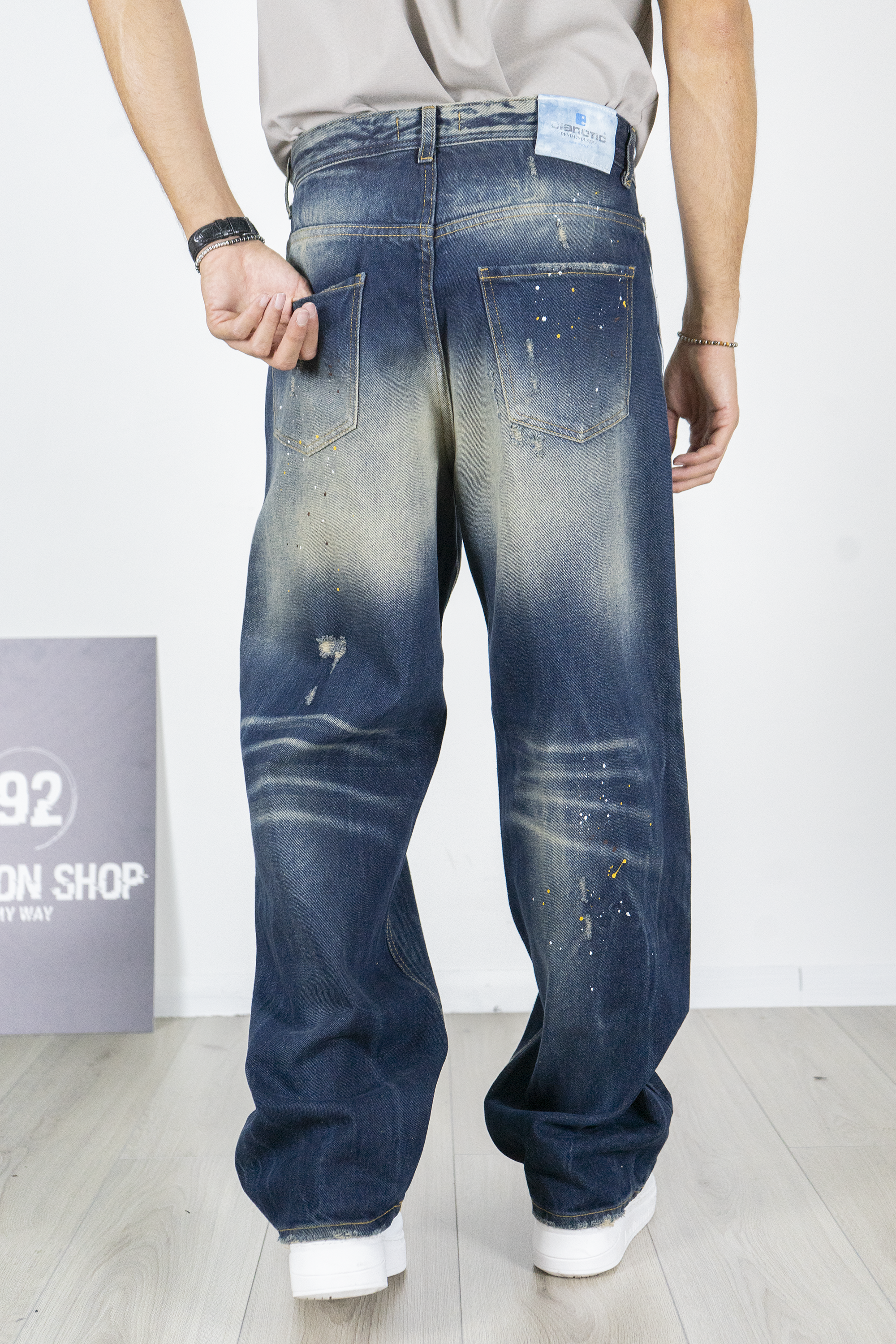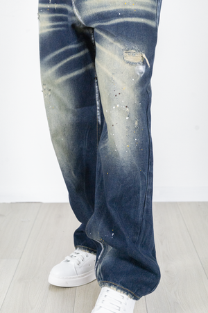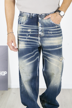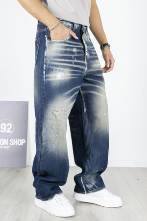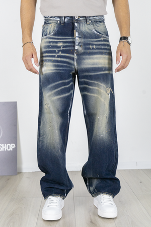 -Jeans uomo super baggy in denim blu scuro con lavaggio effetto usato e schizzi di vernice a contrasto. Il taglio ampio garantisce il massimo comfort e un look urbano di forte impatto, perfetto per chi ama lo stile streetwear oversize. Ideale da abbinare a t-shirt o felpe grafiche e sneakers chunky per un outfit moderno e deciso.