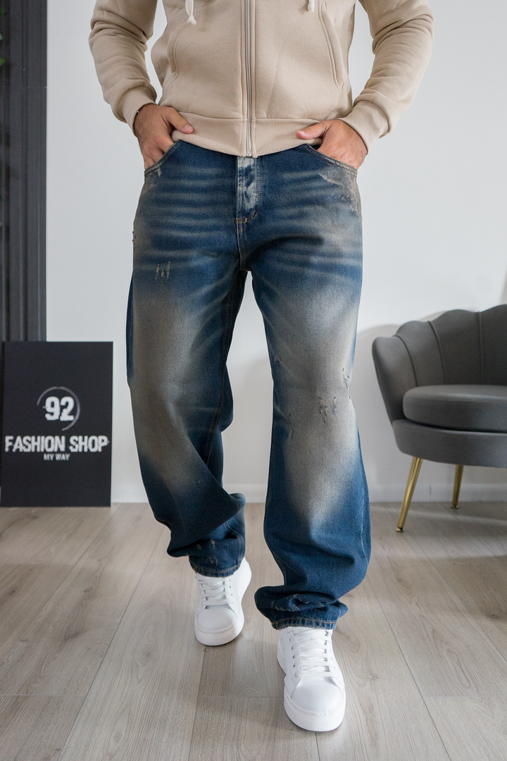 -Jeans uomo modello baggy fit oversize con lavaggio blu effetto used.