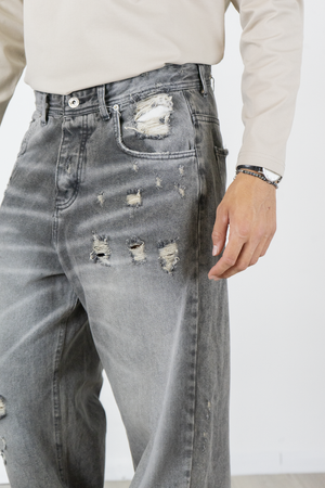 -Jeans uomo baggy in denim grigio con lavaggio sfumato e dettagli strappati effetto distrutto. Il taglio ampio assicura il massimo comfort e un look urbano contemporaneo, perfetto per chi ama lo streetwear oversize. Facile da abbinare a t-shirt o felpa e sneakers per un outfit trendy e di carattere.