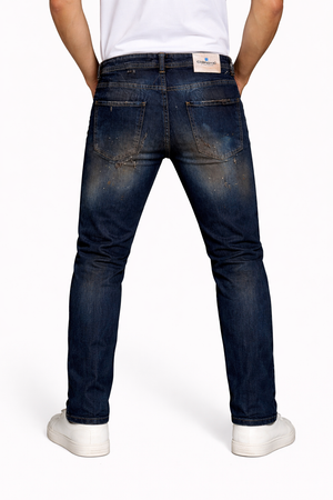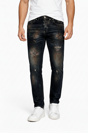 -L'essenza del denim custom. Questo jeans non è un semplice pantalone, ma un concentrato di dettagli tecnici e stile audace. Caratterizzato da un lavaggio blu scuro con sfumature color ruggine/tabacco, è pensato per chi vuole un look unico dall'impronta artigianale.