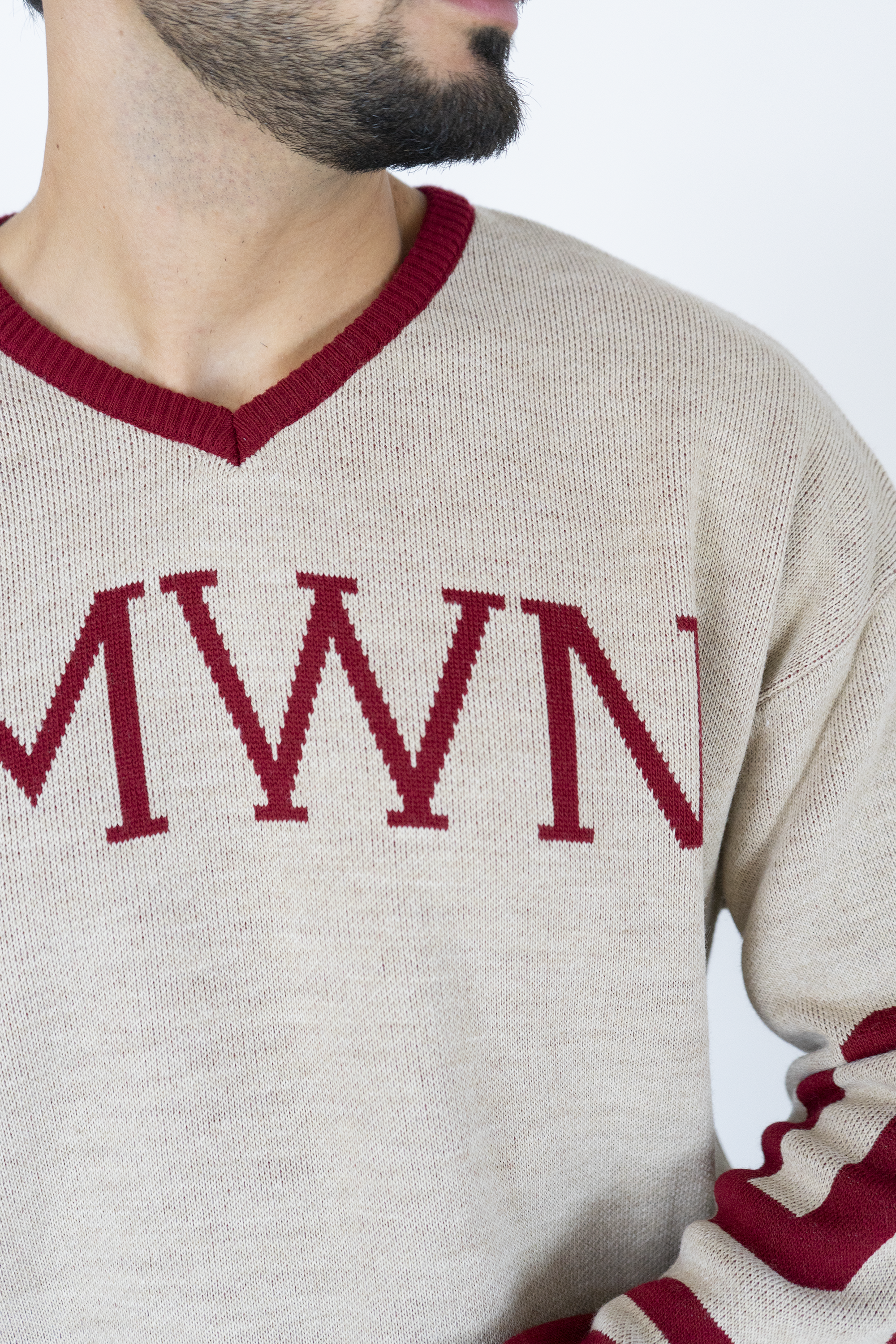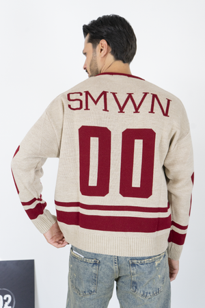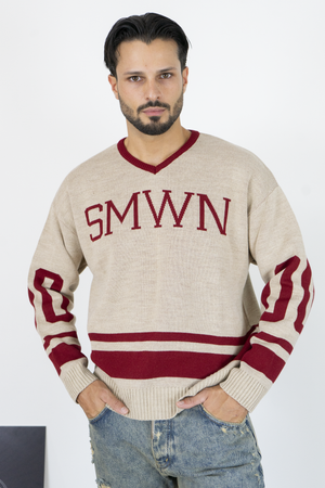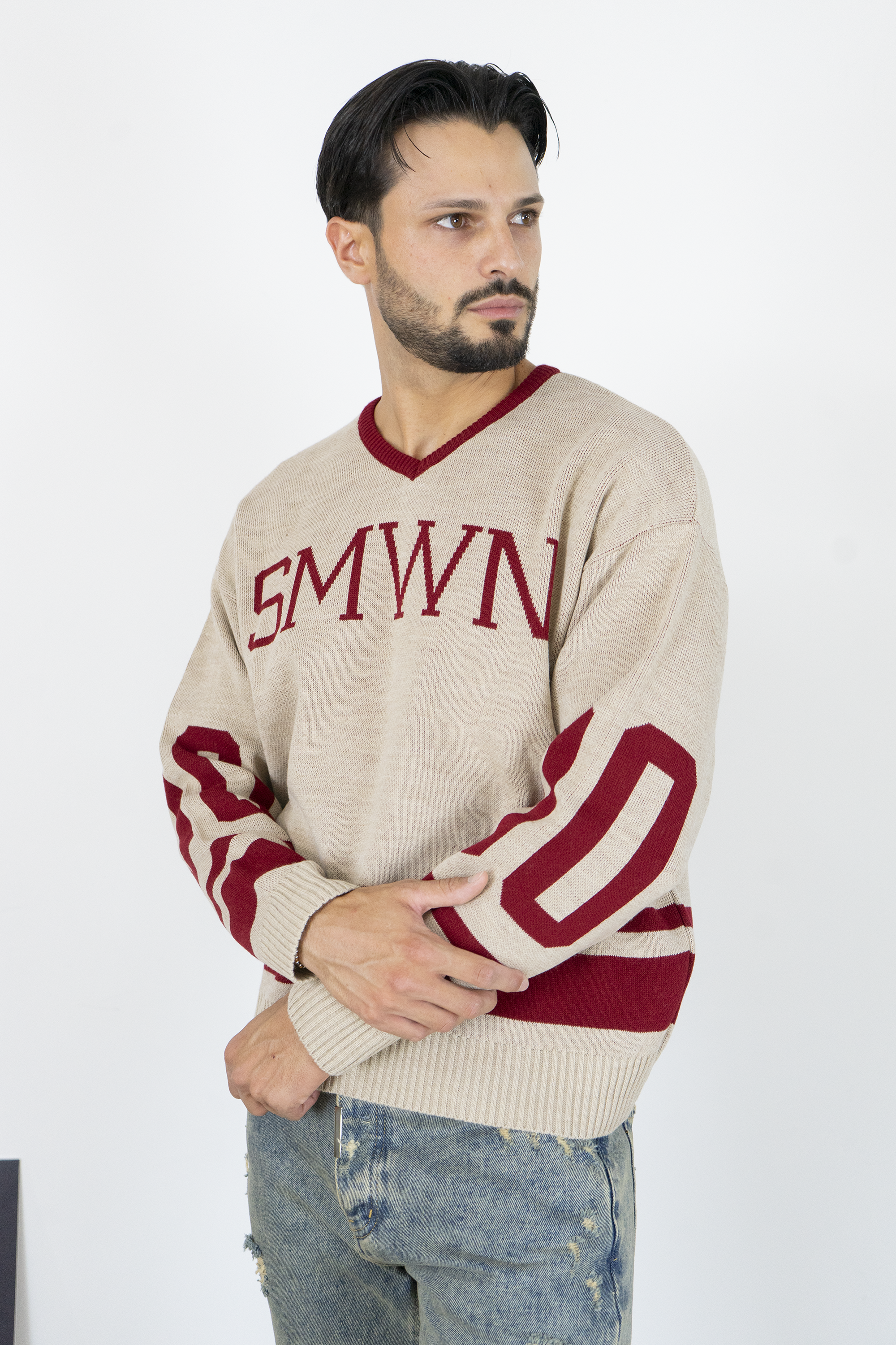 -Maglione uomo in maglia morbida dal design unico e contemporaneo. La base Beige è valorizzata da dettagli a contrasto Rossi su maniche e fascia, con logo frontale SMWN che dona carattere e stile streetwear. Con scollo a V e vestibilità comoda, è perfetto per look casual di tendenza, da abbinare a jeans o pantaloni palazzo per outfit versatili e moderni.