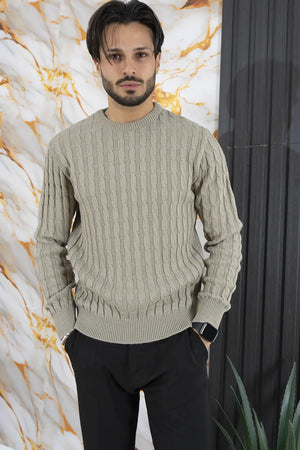 -Dettagli: Esalta il tuo stile invernale con questo maglione girocollo da uomo impreziosito da una raffinata fantasia a trecce. La lavorazione intrecciata dona un tocco di eleganza artigianale, perfetto per chi cerca un capo versatile e di classe per affrontare i mesi più freddi.