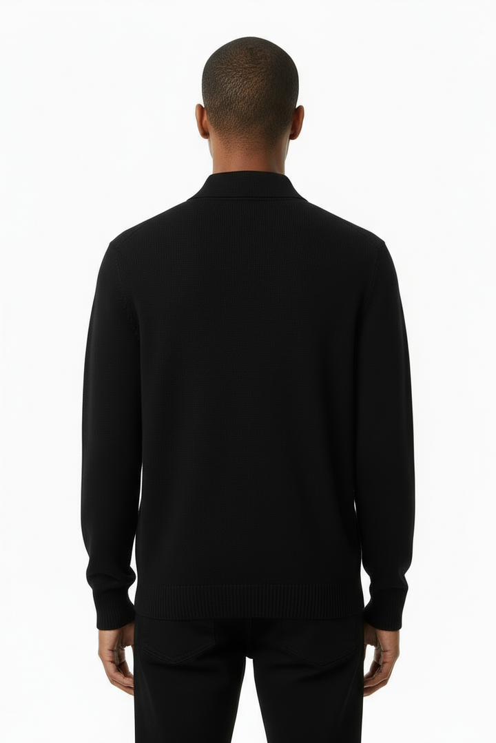 -Maglione uomo in maglia fine con mezza zip frontale e colletto polo.