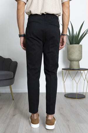 -Dettagli: Questo pantalone casual-elegante è realizzato in un raffinato tessuto gabardine, che conferisce un aspetto sofisticato e una vestibilità confortevole. Presenta un'abbottonatura laterale che aggiunge un tocco distintivo al design, mentre le pinces frontali offrono una silhouette elegante e slanciata. Il modello capri, con la sua lunghezza che arriva appena sopra la caviglia, rende questo pantalone perfetto per un look versatile che può essere facilmente abbinato sia a una camicia formale che a una maglietta casual. Ideale per le occasioni che richiedono un equilibrio tra stile e comodità, questo pantalone rappresenta un must-have nel guardaroba moderno.