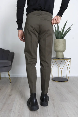 -Dettagli: Questo pantalone casual-elegante è realizzato in un raffinato tessuto gabardine, che conferisce un aspetto sofisticato e una vestibilità confortevole. Presenta un'abbottonatura laterale che aggiunge un tocco distintivo al design, mentre le pinces frontali offrono una silhouette elegante e slanciata. Il modello capri, con la sua lunghezza che arriva appena sopra la caviglia, rende questo pantalone perfetto per un look versatile che può essere facilmente abbinato sia a una camicia formale che a una maglietta casual. Ideale per le occasioni che richiedono un equilibrio tra stile e comodità, questo pantalone rappresenta un must-have nel guardaroba moderno.