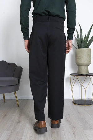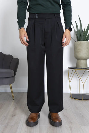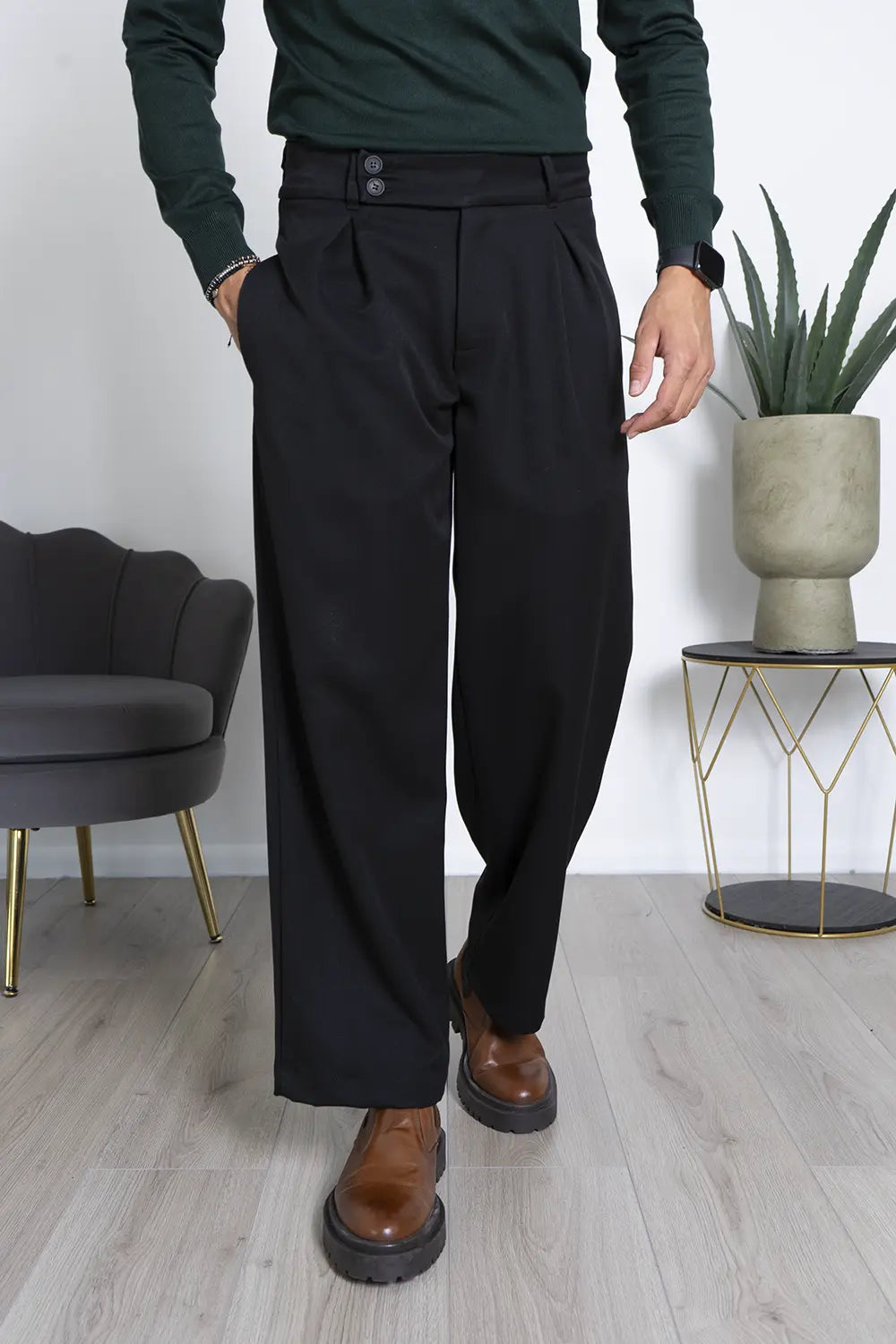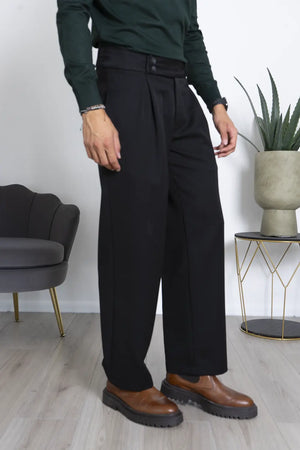 -Dettagli: Il pantalone è caratterizzato da una vita alta con doppio bottone e gamba larga. Il design con Vita alta e il taglio ampio offrono comodità e versatilità, mentre il tessuto morbido e fluido si adatta a vari tipi di fisico. Questo pantalone può essere indossato sia in contesti casual che formali, risultando sempre elegante e confortevole.