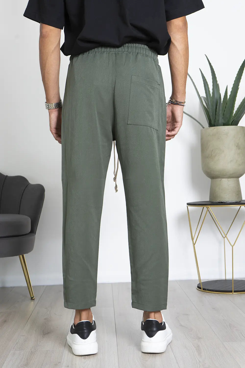 -Dettagli: Vita con elastico e coulisse regolabile, taglio dritto fino alla caviglia senza coprirla.