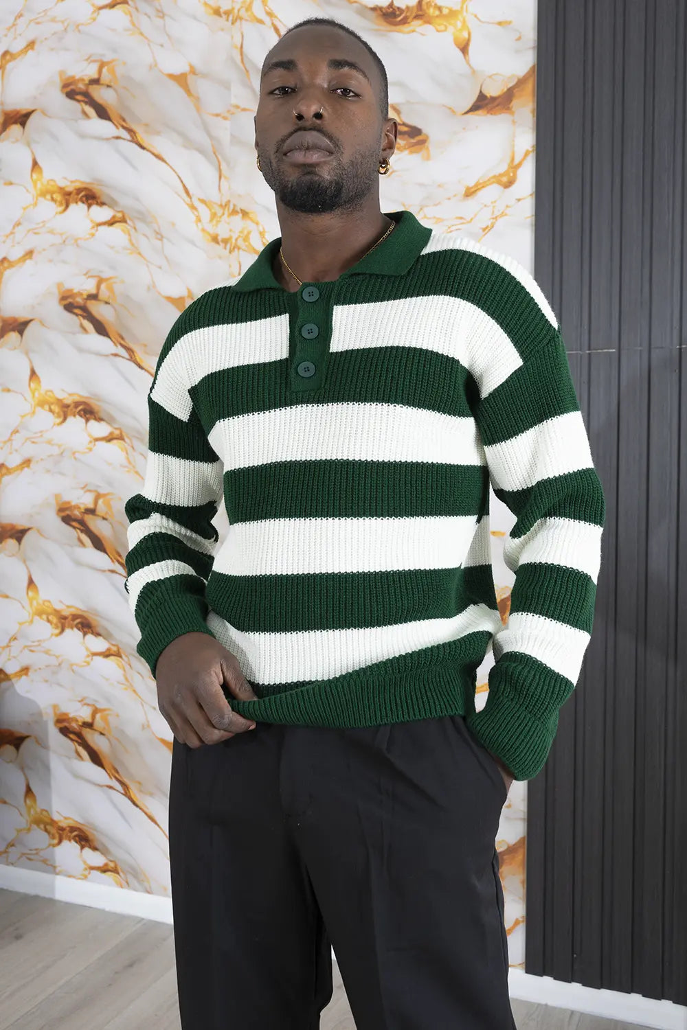 -Dettagli: Aggiungi un tocco di eleganza casual al tuo guardaroba con questo maglione polo in misto lana. Il design raffinato si distingue per il colletto a polo con bottoni, che dona un look versatile e moderno. La lavorazione a costine e le fasce orizzontali bicolore creano un effetto visivo sofisticato e dinamico, ideale per chi cerca uno stile originale ma discreto. Realizzato con un mix di lana di alta qualità, questo maglione offre una piacevole sensazione di calore e morbidezza, perfetta per le giornate più fresche.