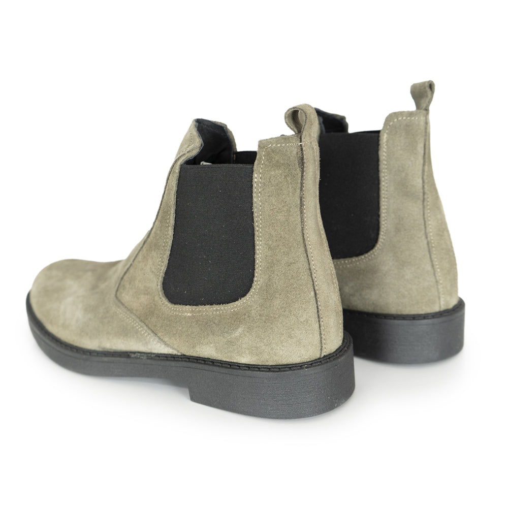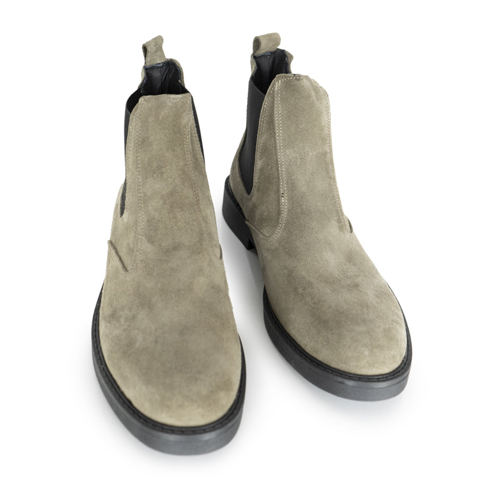 Stivaletti Chelsea attillati e alti fino alla caviglia con un pannello laterale elastico prodotti in Italia. La linguatta posteriore che li caratterizza, consente di tirare lo stivale quando lo si indossa. In pelle scamosciata, con una super suola in gomma COMFORT!