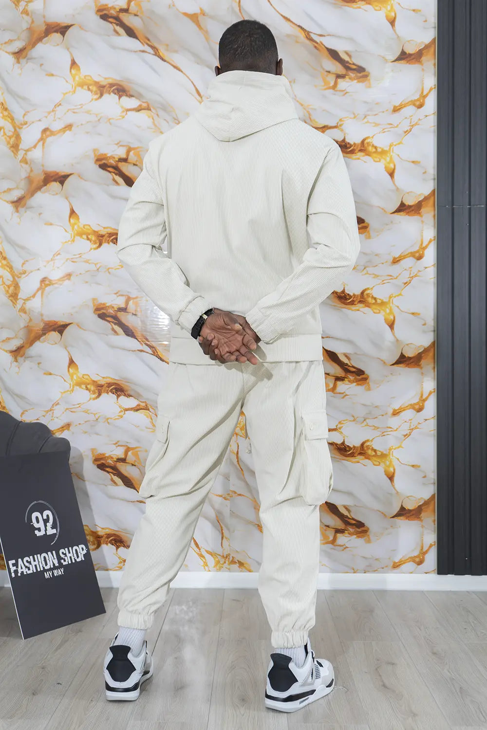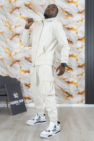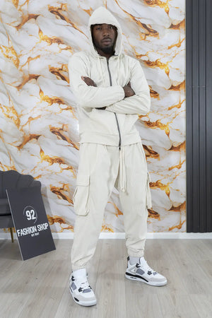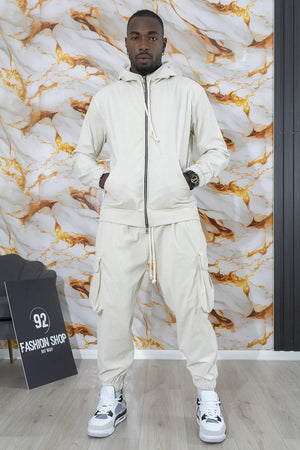 -Dettagli: Tuta casual in velluto composto da una giacca con cappuccio e pantaloni cargo. La giacca ha una chiusura a zip frontale, coulisse regolabile per il cappuccio e polsini elasticizzati. I pantaloni presentano ampie tasche cargo laterali e un elastico alla caviglia per un look rilassato, perfetto per un outfit casual e confortevole. I dettagli in velluto danno un tocco morbido e vintage al set, che combina comodità e stile.