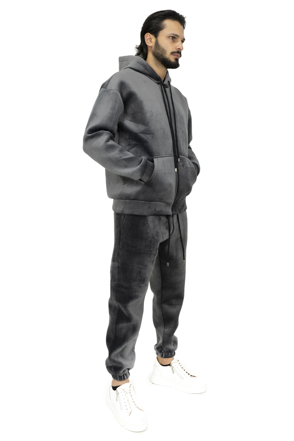 -Dettagli: Tuta In Scuba (Tessuto simile al jersey, liscio e bielastico che ricorda molto il neoprene; ha la caratteristica di essere molto comodo e resistente) Felpa Con Zip e cappuccio.
