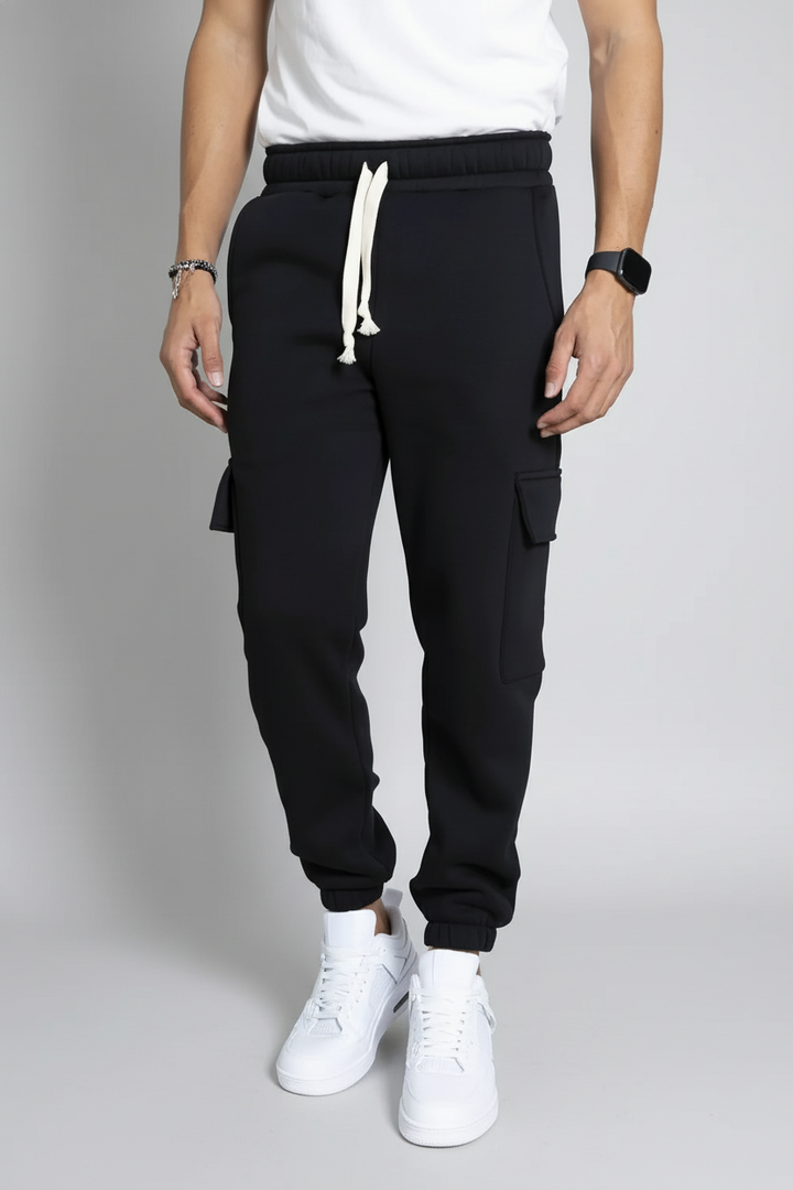 Il pantalone cargo nero è caratterizzato da tasconi laterali e fondo jogger con elastico.